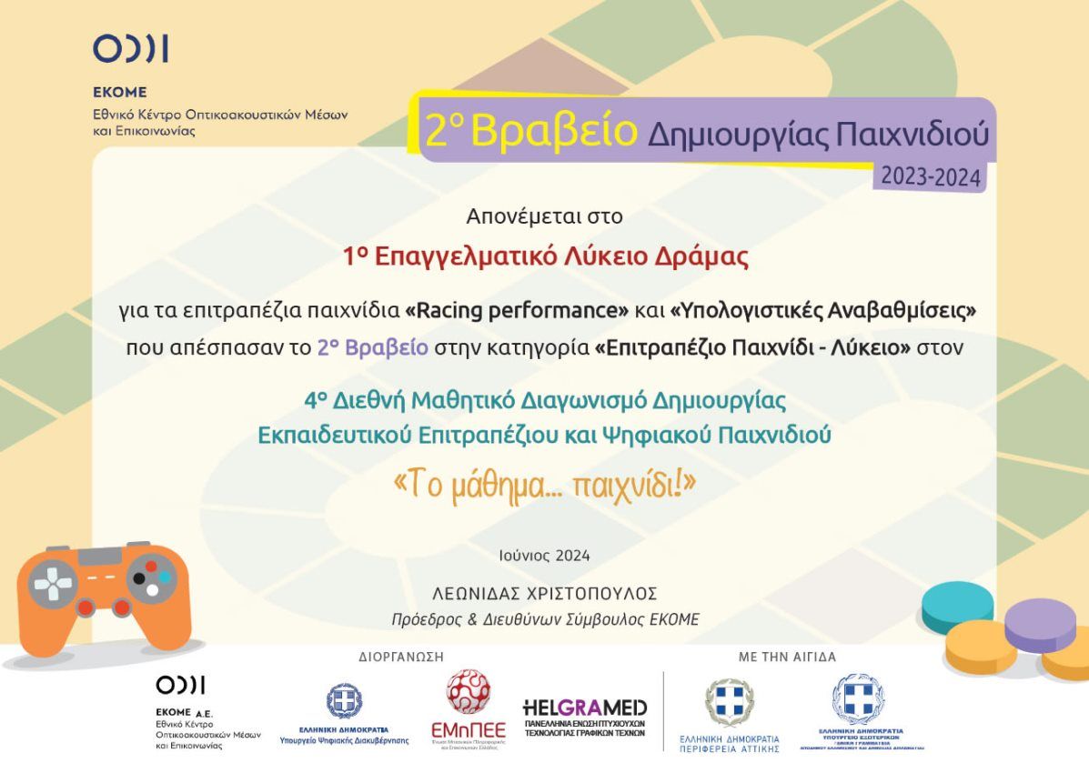 Στο πλαίσιο του 4ου Διεθνούς Μαθητικού Διαγωνισμού Δημιουργίας Επιτραπέζιου και Ψηφιακού Αφηγηματικού Παιχνιδιού «Το μάθημα… παιχνίδι!» του Εθνικού Κέντρου Οπτικοακουστικών Μέσων και Επικοινωνίας-ΕΚΟΜΕ, τα έργα εστάλησαν και προκρίθηκαν μέσα από πλήθος εξαιρετικών επίσης συμμετοχών κι έλαβαν εξ ημισείας το 2ο βραβείο, δικαιώνοντας τον κόπο τόσο των μαθητών όσο και των καθηγητών που ενεπλάκησαν στη δημιουργία τους.