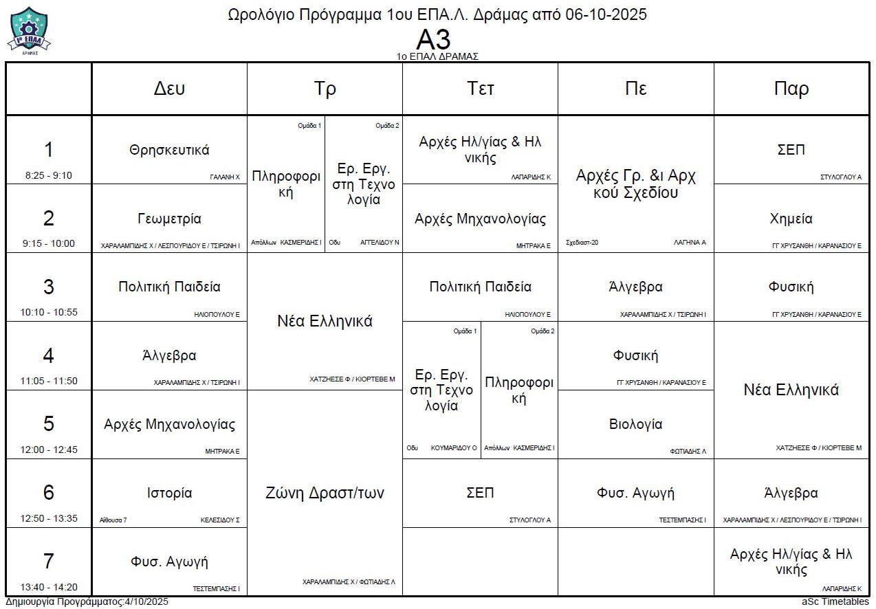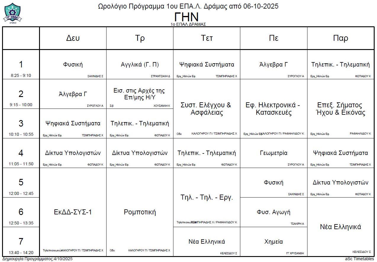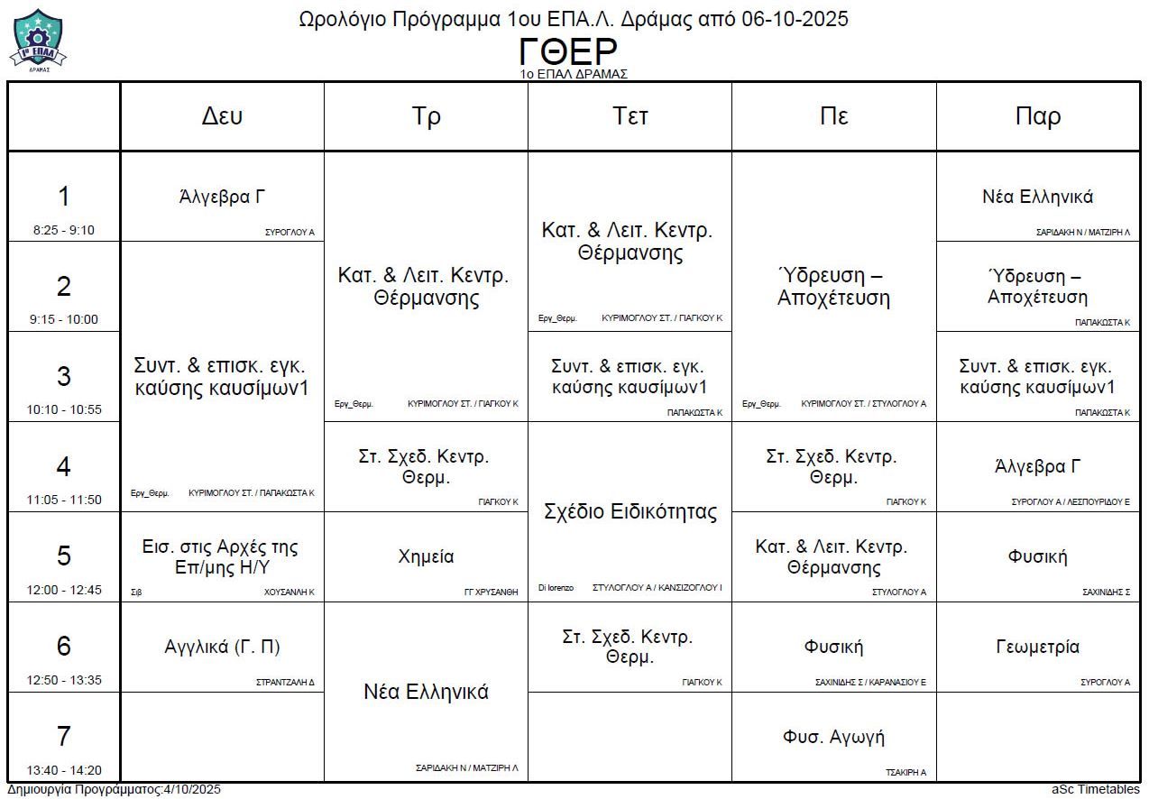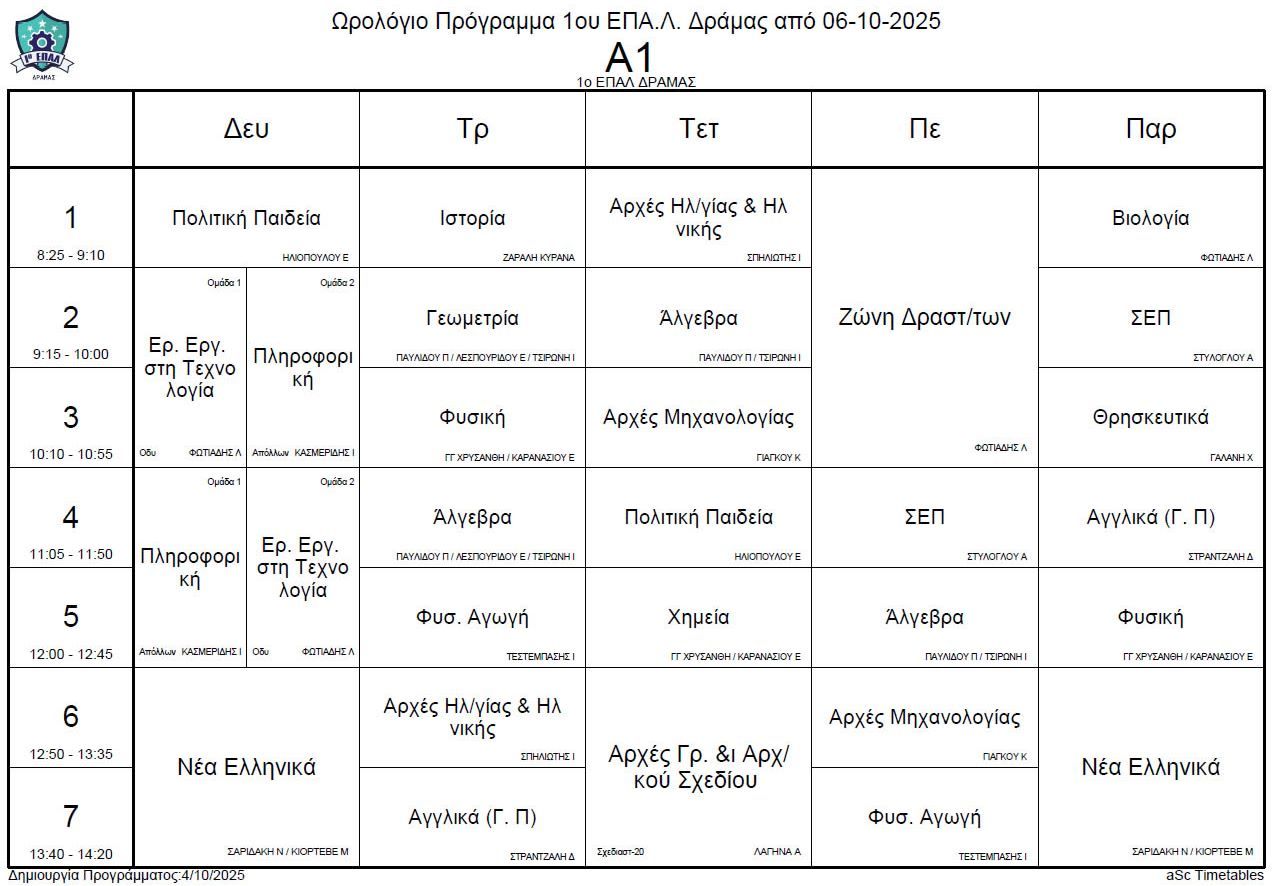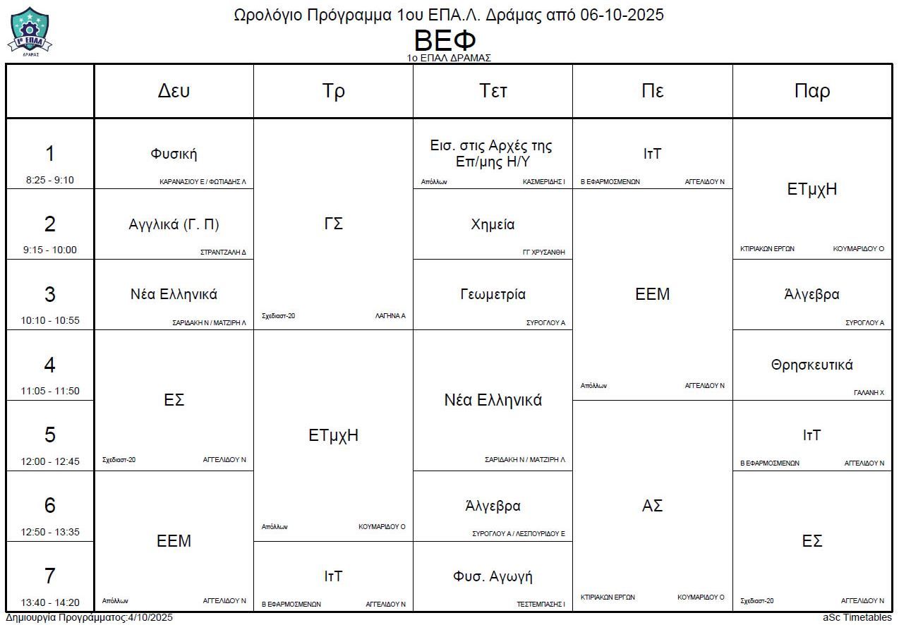Ωρολόγιο πρόγραμμα λειτουργίας του σχολείου από την Δευτέρα 06-10-2025
