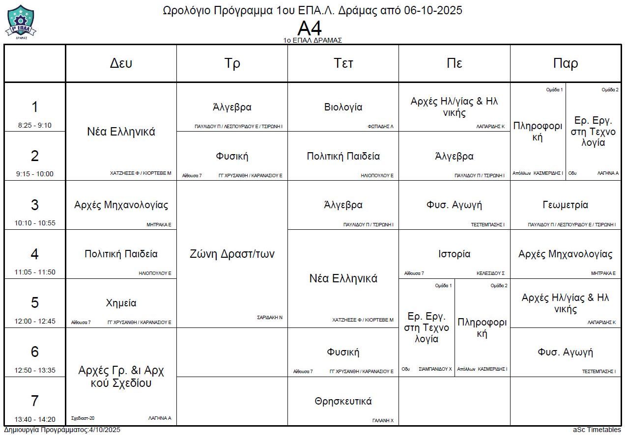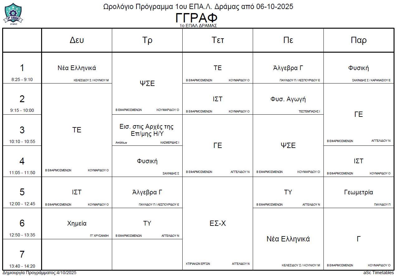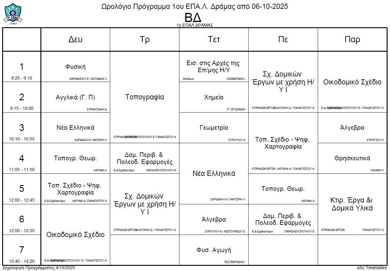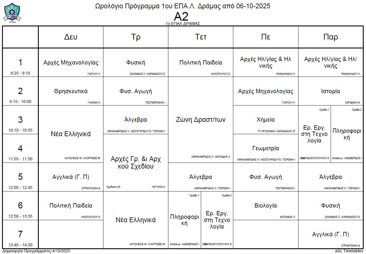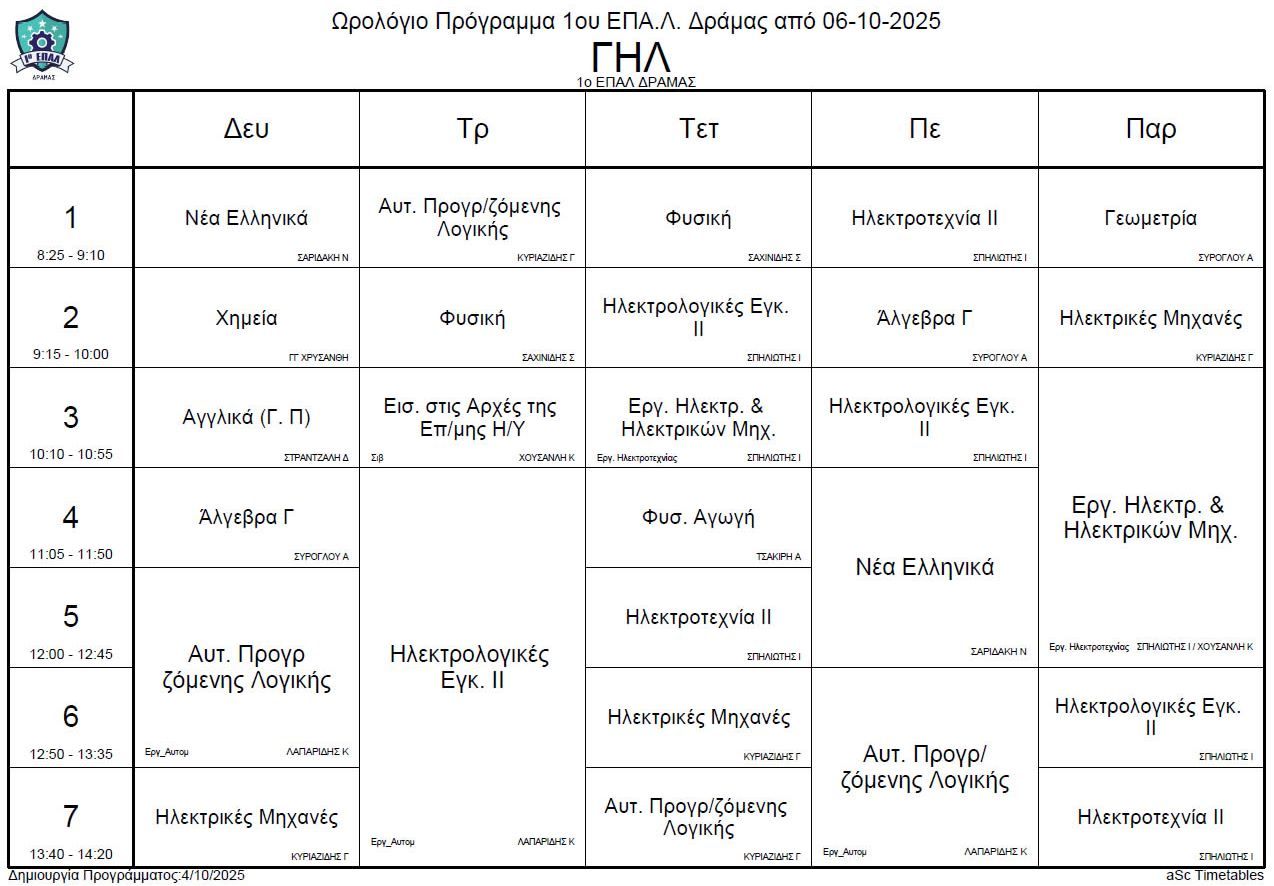 Ωρολόγιο πρόγραμμα λειτουργίας του σχολείου από την Δευτέρα 06-10-2025