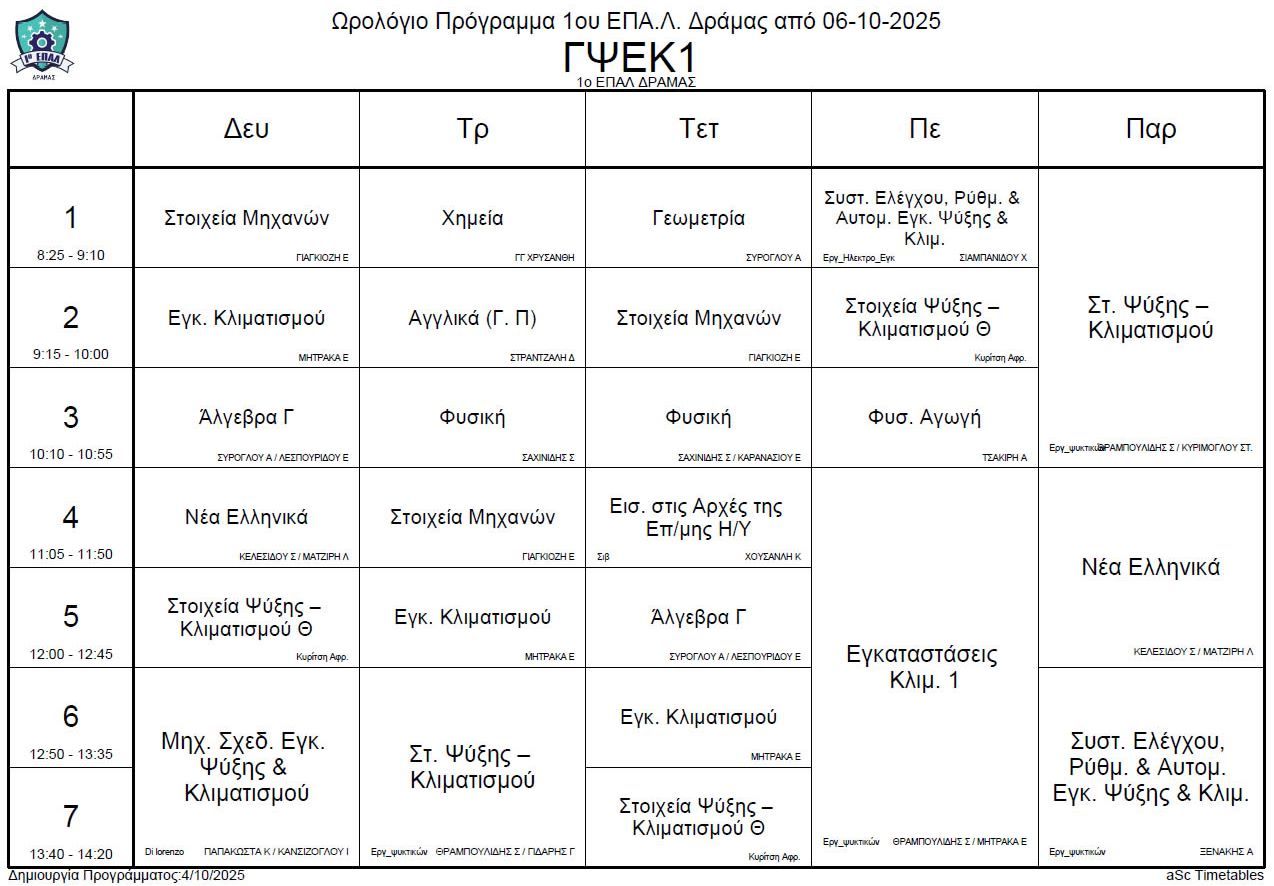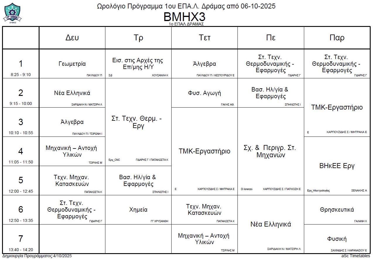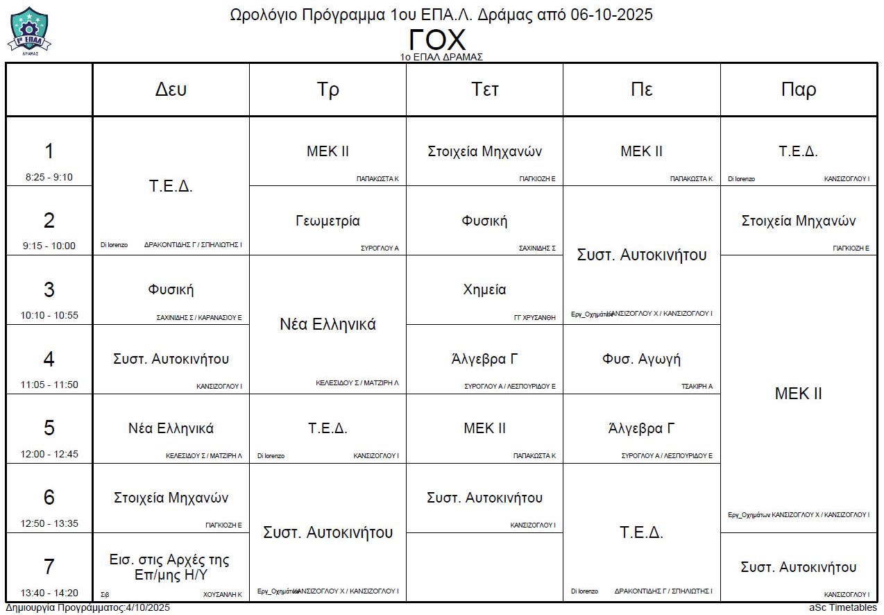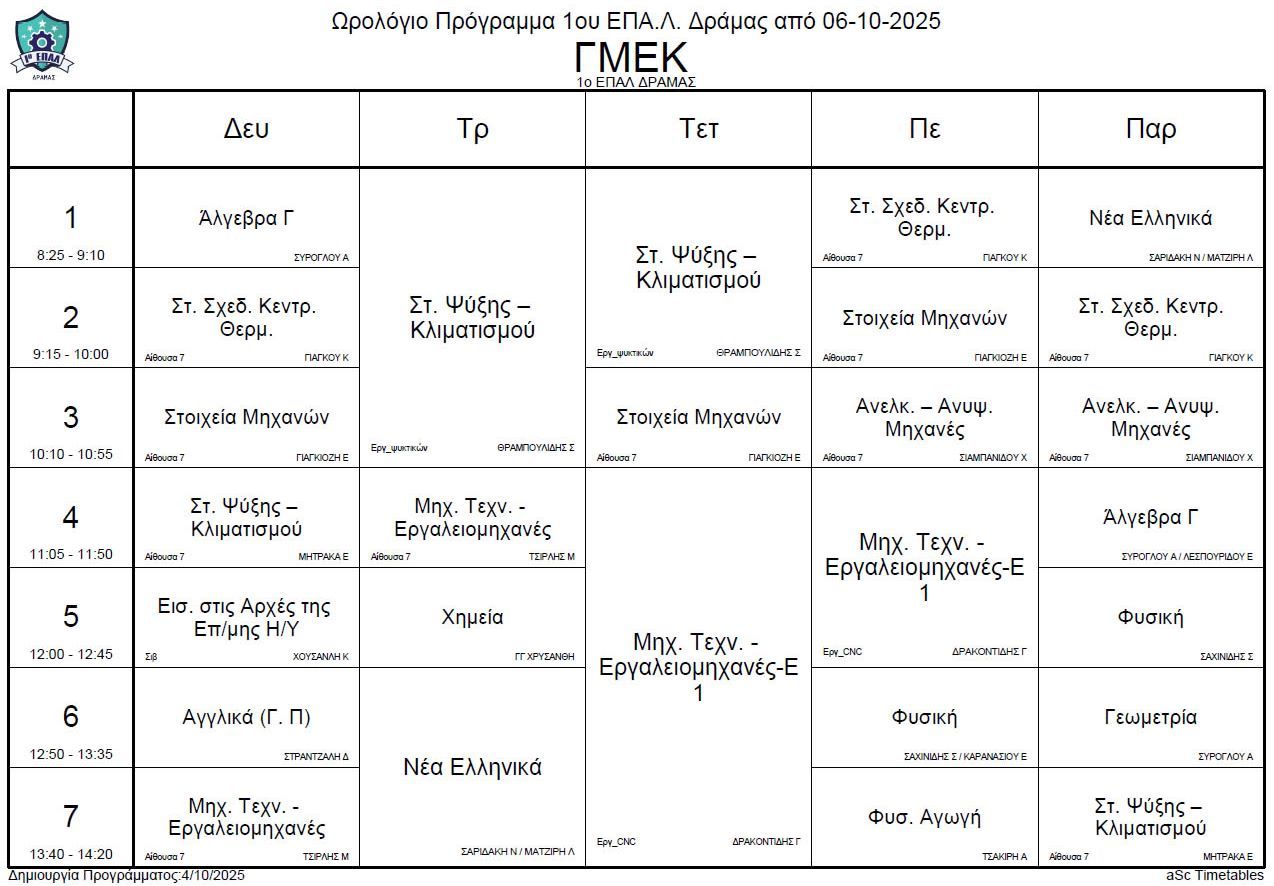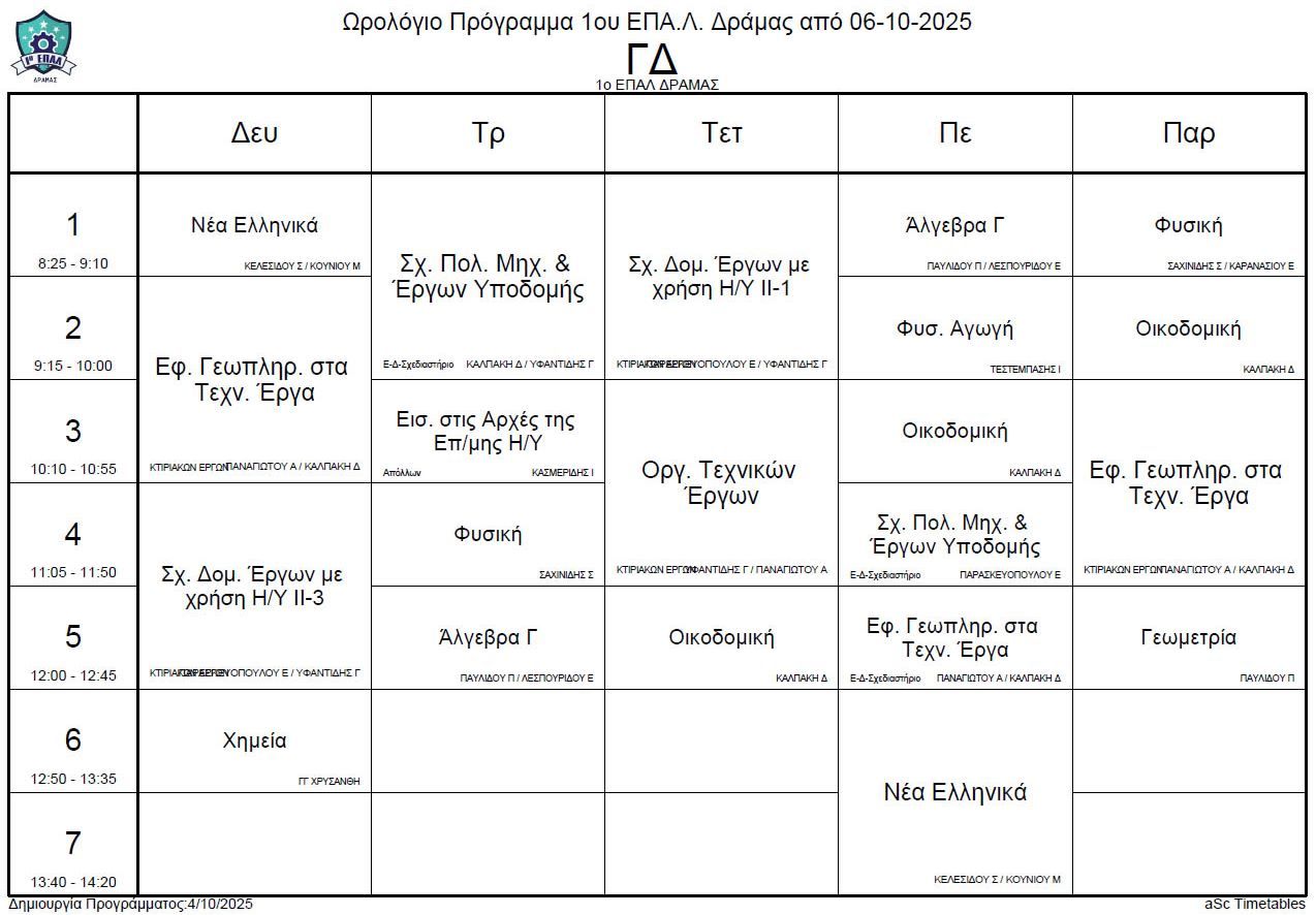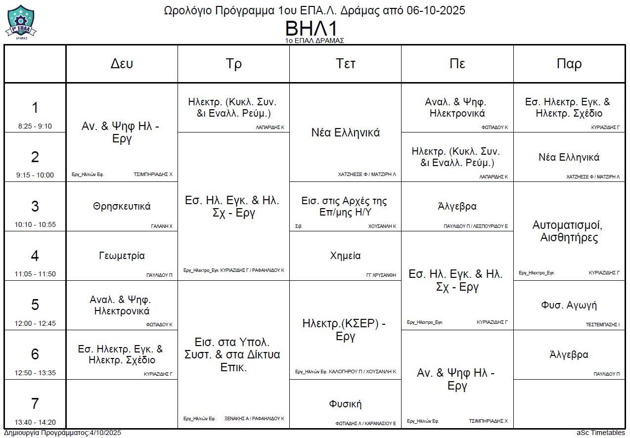 Ωρολόγιο πρόγραμμα λειτουργίας του σχολείου από την Δευτέρα 06-10-2025