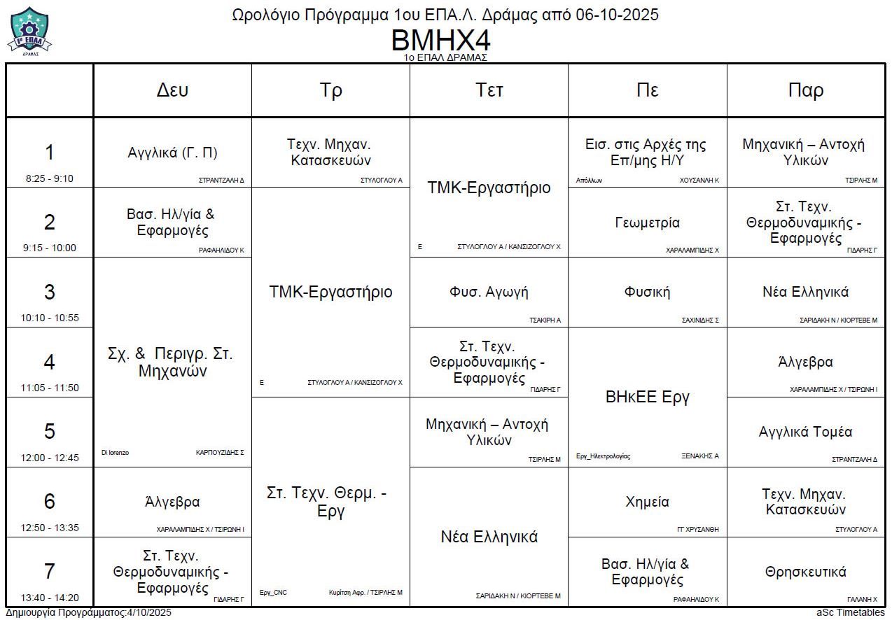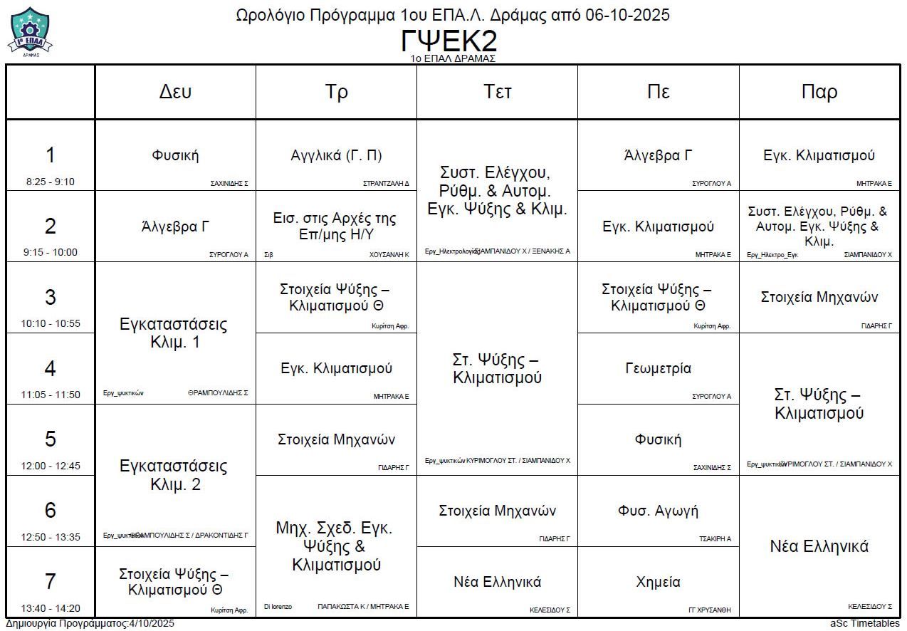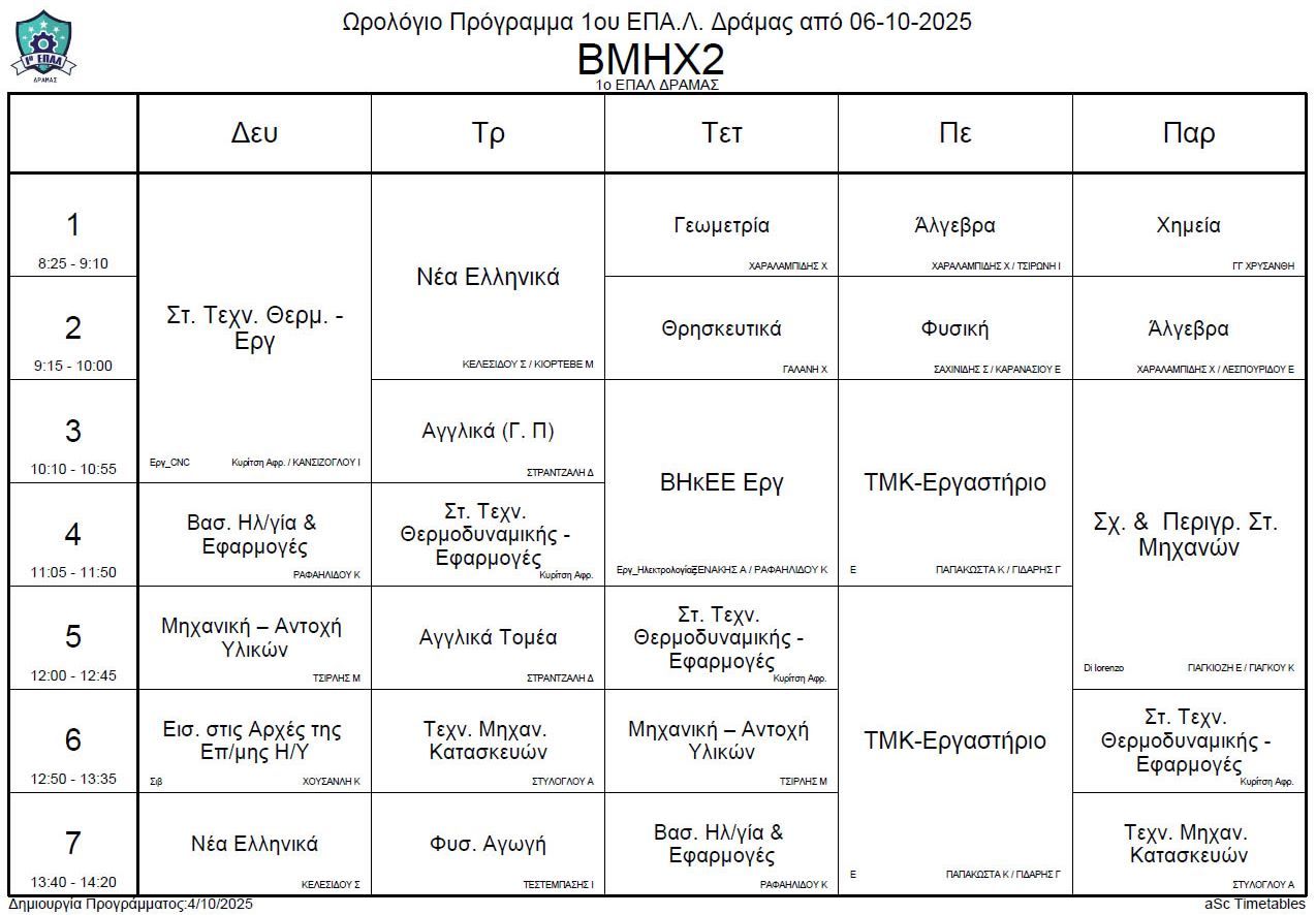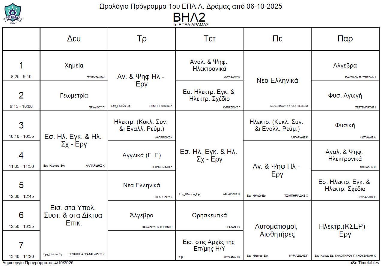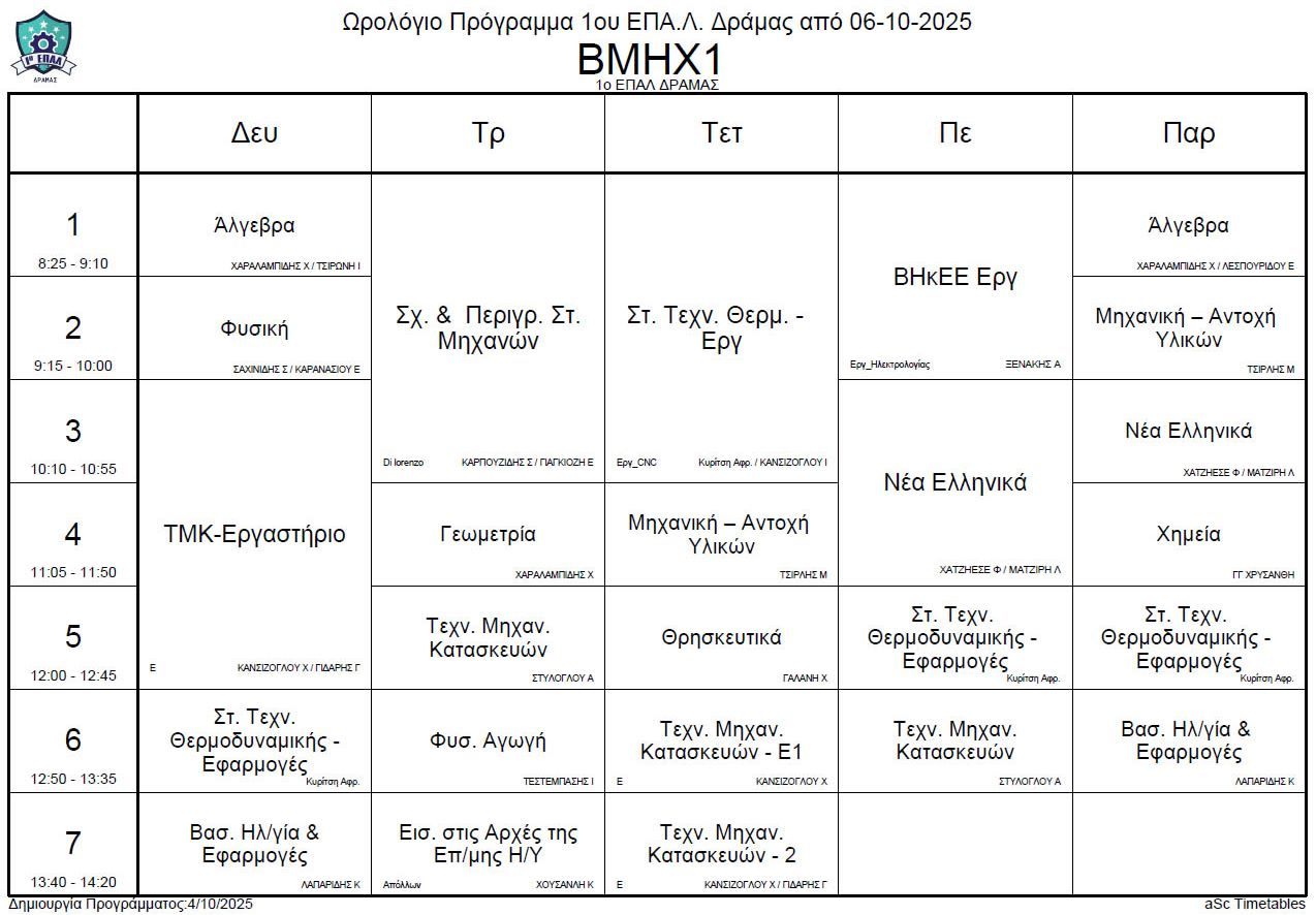Ωρολόγιο πρόγραμμα λειτουργίας του σχολείου από την Δευτέρα 06-10-2025