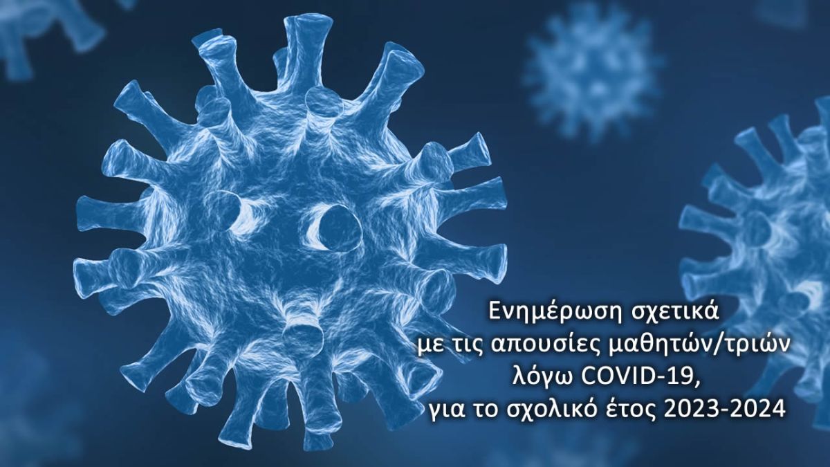 Κατόπιν ερωτημάτων σχετικά με τις απουσίες μαθητών/τριών λόγω του COVID-19, σας ενημερώνουμε ότι με απόφαση του οικείου Συλλόγου Διδασκόντων/ουσών των σχολικών μονάδων, καταχωρίζονται αλλά δεν προσμετρώνται οι απουσίες από τα μαθήματα μαθητών/τριών έως πέντε (5) εργάσιμων ημερών, που οφείλονται στη νόσηση από κορωνοϊό COVID-19, για το σχολικό έτος 2023-24. Η