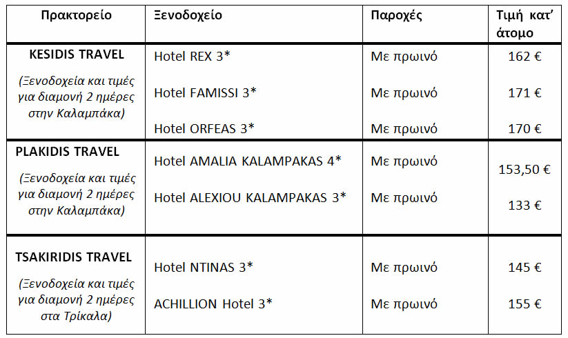 Στη συνέχεια η επιτροπή, αφού έλαβε υπόψη τα ποσοτικά και ποιοτικά κριτήρια από τις υποβληθείσες προσφορές, και αναζήτησε πληροφορίες για τα προτεινόμενα ξενοδοχεία, ομόφωνα επέλεξε α) ως πιο κατάλληλη -η οποία πληρούσε όλες τις προϋποθέσεις της προκήρυξης- και β) ως πιο συμφέρουσα, την προσφορά του Τουριστικού Γραφείου HERODOTOUS TRAVEL, η οποία ήταν η μοναδική που παρέχει διαμονή στα Τρίκαλα. Επιλέχθηκε το ξενοδοχείο ACHILLION 3* με πρωινό. Το κόστος της εκδρομής κατ' άτομο με πρωινό ανέρχεται στα 155 €.