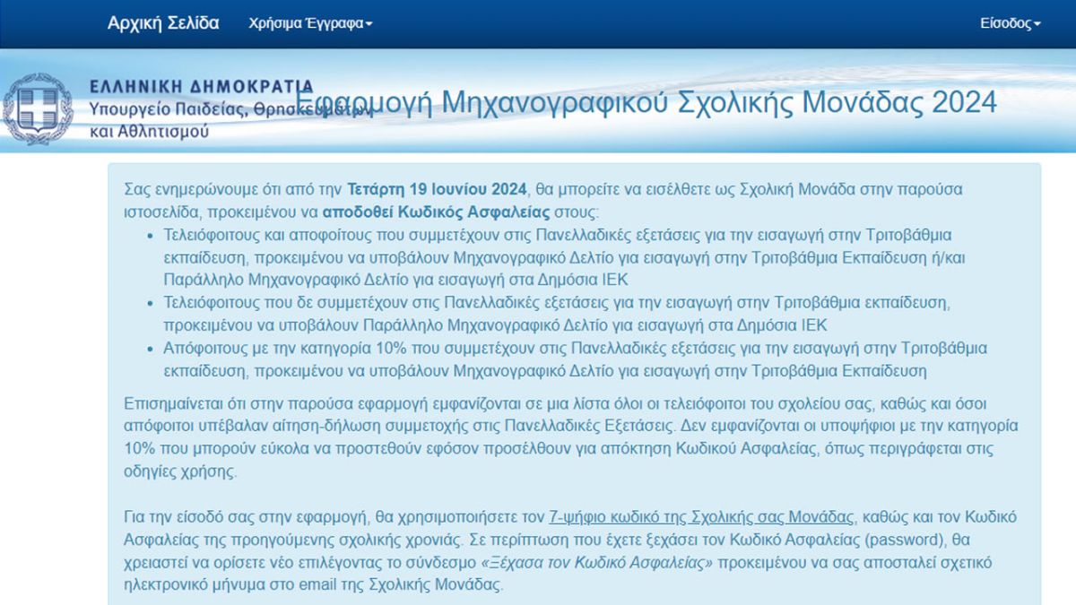 Συνεπώς, όλοι οι ενδιαφερόμενοι θα πρέπει να προσέλθουν στο Λύκειό τους, για να αποκτήσουν προσωπικό κωδικό ασφαλείας (password), από την Τετάρτη 19 Ιουνίου ως και την Παρασκευή 28 Ιουνίου 2024.