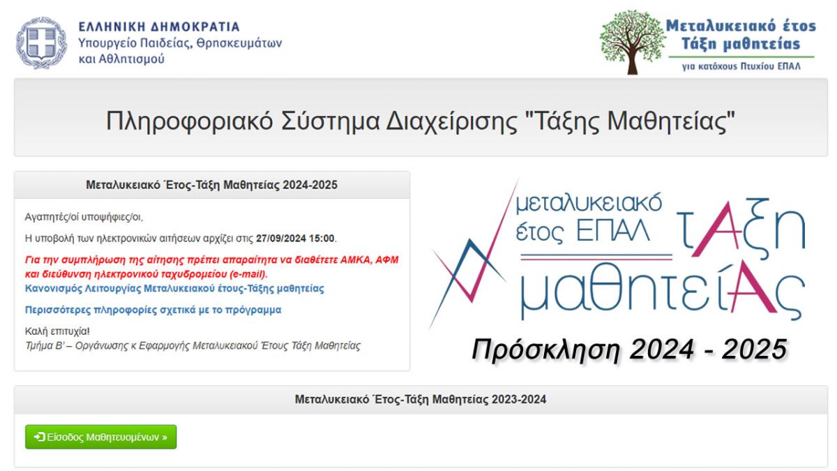 Πρόσκληση υποβολής αιτήσεων μαθητευόμενων για συμμετοχή στο Μεταλυκειακό Έτος - Τάξη Μαθητείας - περιόδου 2024-2025