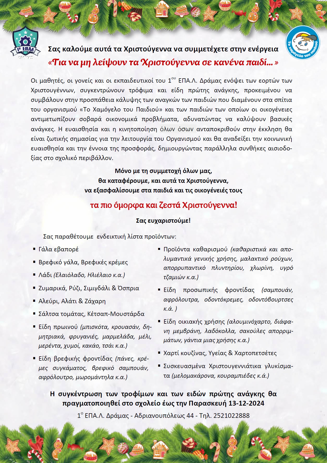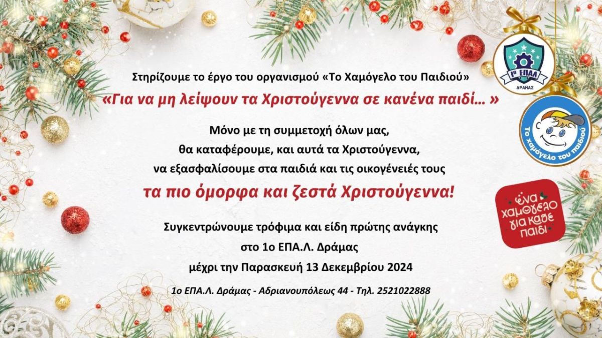 Οι μαθητές, οι γονείς και οι εκπαιδευτικοί του 1ου ΕΠΑ.Λ. Δράμας ενόψει των εορτών των Χριστουγέννων, συγκεντρώνουν τρόφιμα και είδη πρώτης ανάγκης, προκειμένου να συμβάλουν στην προσπάθεια κάλυψης των αναγκών των παιδιών που διαμένουν στα σπίτια του οργανισμού «Το Χαμόγελο του Παιδιού» και των παιδιών των οποίων οι οικογένειες αντιμετωπίζουν σοβαρά οικονομικά προβλήματα, αδυνατώντας να καλύψουν βασικές ανάγκες. Η ευαισθησία και η κινητοποίηση των παιδιών που θα ανταποκριθούν στην έκκληση θα είναι ζωτικής σημασίας για την λειτουργία του Οργανισμού και θα αναδείξει την κοινωνική ευαισθησία και την έννοια της προσφοράς, δημιουργώντας παράλληλα συνθήκες αισιοδοξίας στο σχολικό περιβάλλον.