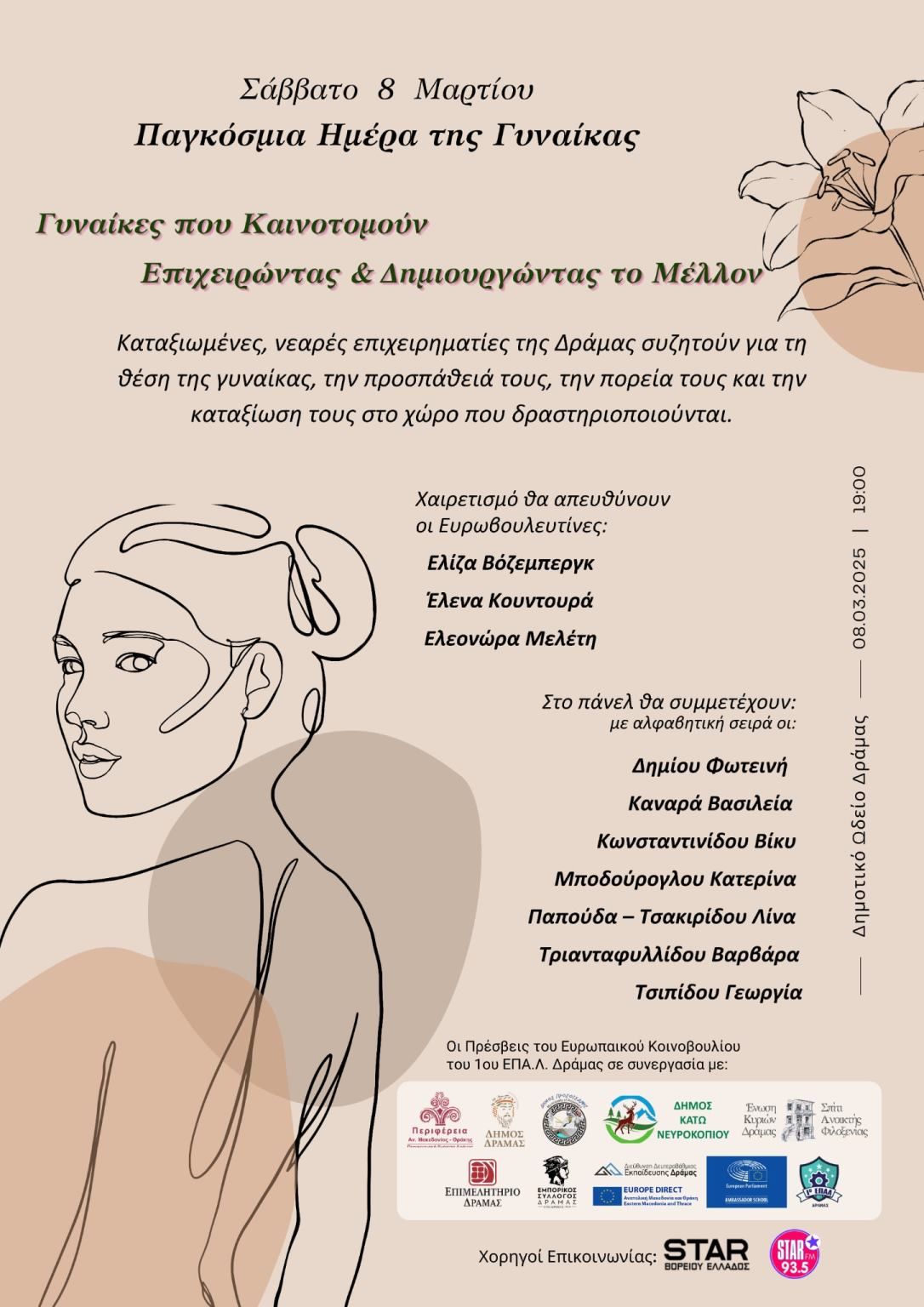 Η εκδήλωση «Γυναίκες που Καινοτομούν, Επιχειρώντας & Δημιουργώντας το Μέλλον» πραγματοποιήθηκε το Σάββατο 8 Μαρτίου 2025, στο Δημοτικό Ωδείο Δράμας, με στόχο να αναδείξει τον ρόλο των γυναικών στην καινοτομία και την επιχειρηματικότητα. Οκτώ καταξιωμένες επιχειρηματίες της Δράμας μοιράστηκαν τις εμπειρίες τους, ενώ μαθητές του προγράμματος Πρέσβεις του Ευρωπαϊκού Κοινοβουλίου του 1ου ΕΠΑΛ Δράμας συντόνισαν τη συζήτηση.