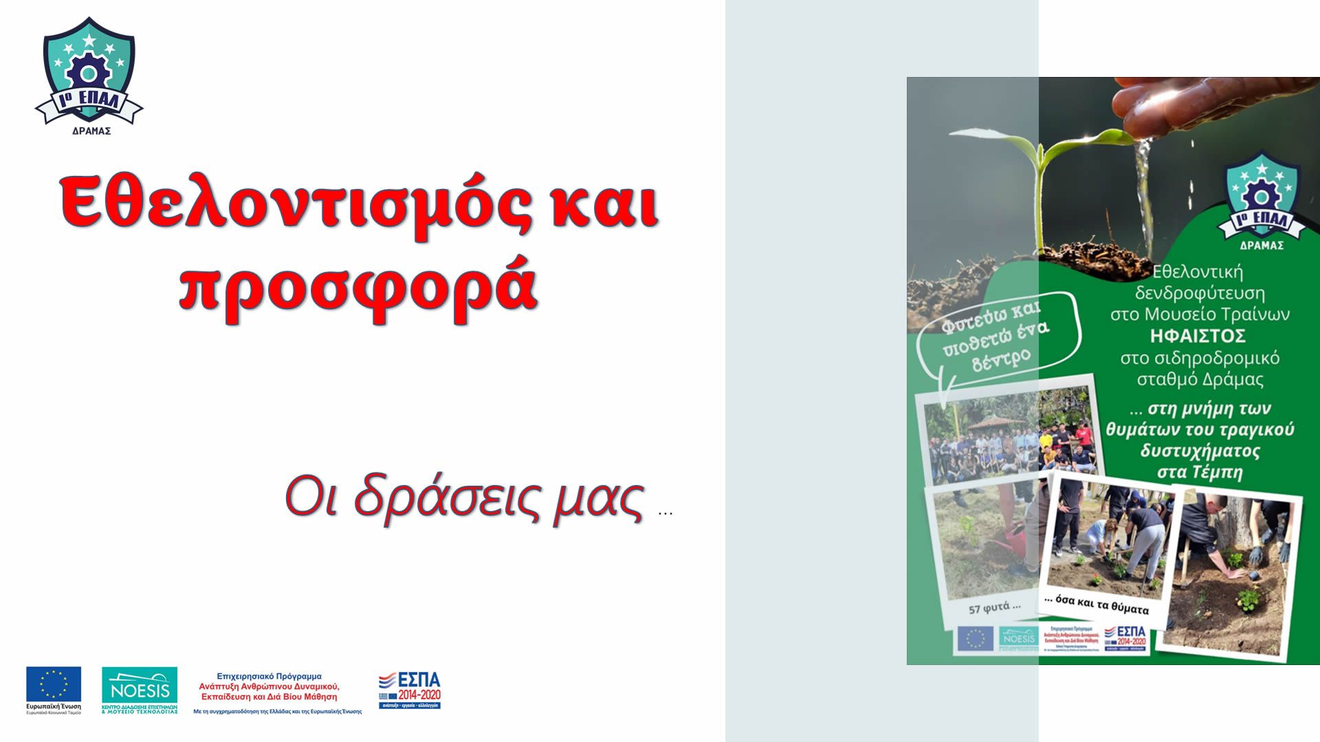 Επίσης, ευχαριστούμε τον αντιδήμαρχο Δράμας κ. Δερματίδη Ανέστη και τον κ. Βαλσαμίδη Γεώργιο για την διάθεση των φυτών και την αντιδήμαρχο παιδείας και αθλητισμού κα. Τόλιου Αναστασία η οποία συμμετείχε στη δράση.