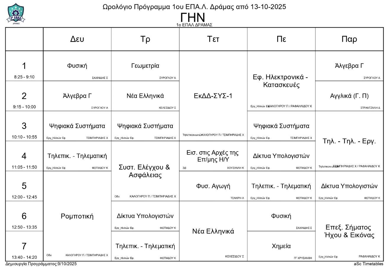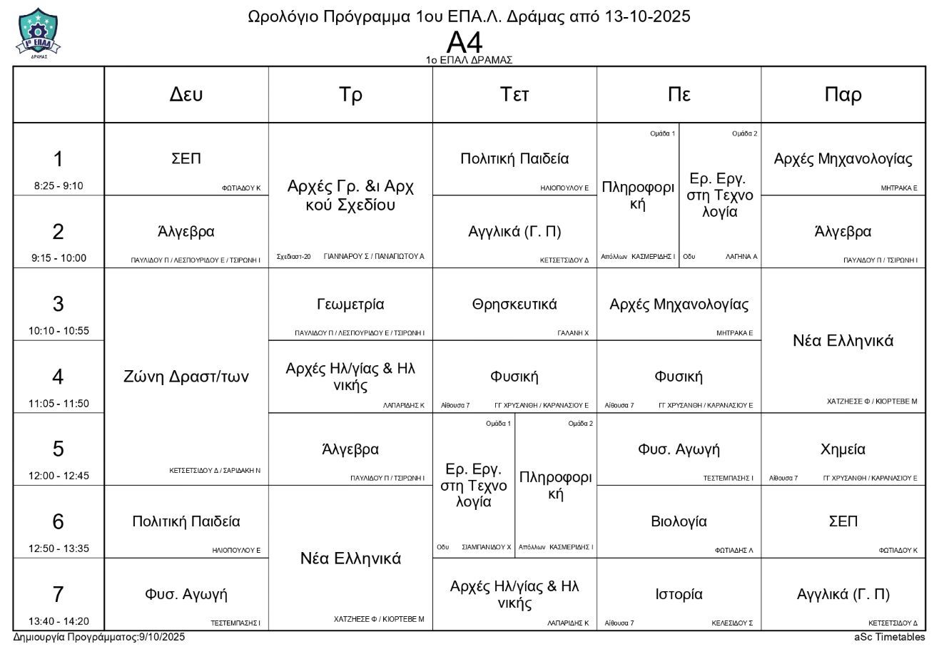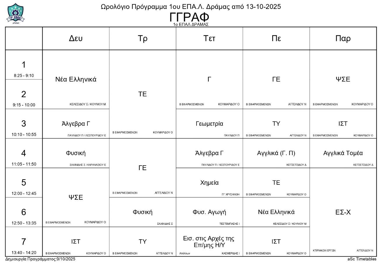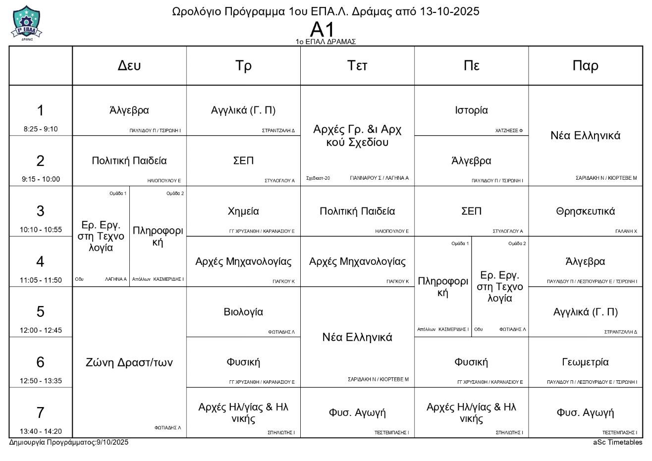 Ωρολόγιο πρόγραμμα λειτουργίας του σχολείου από την Δευτέρα 13-10-2025