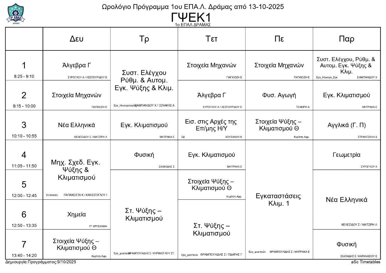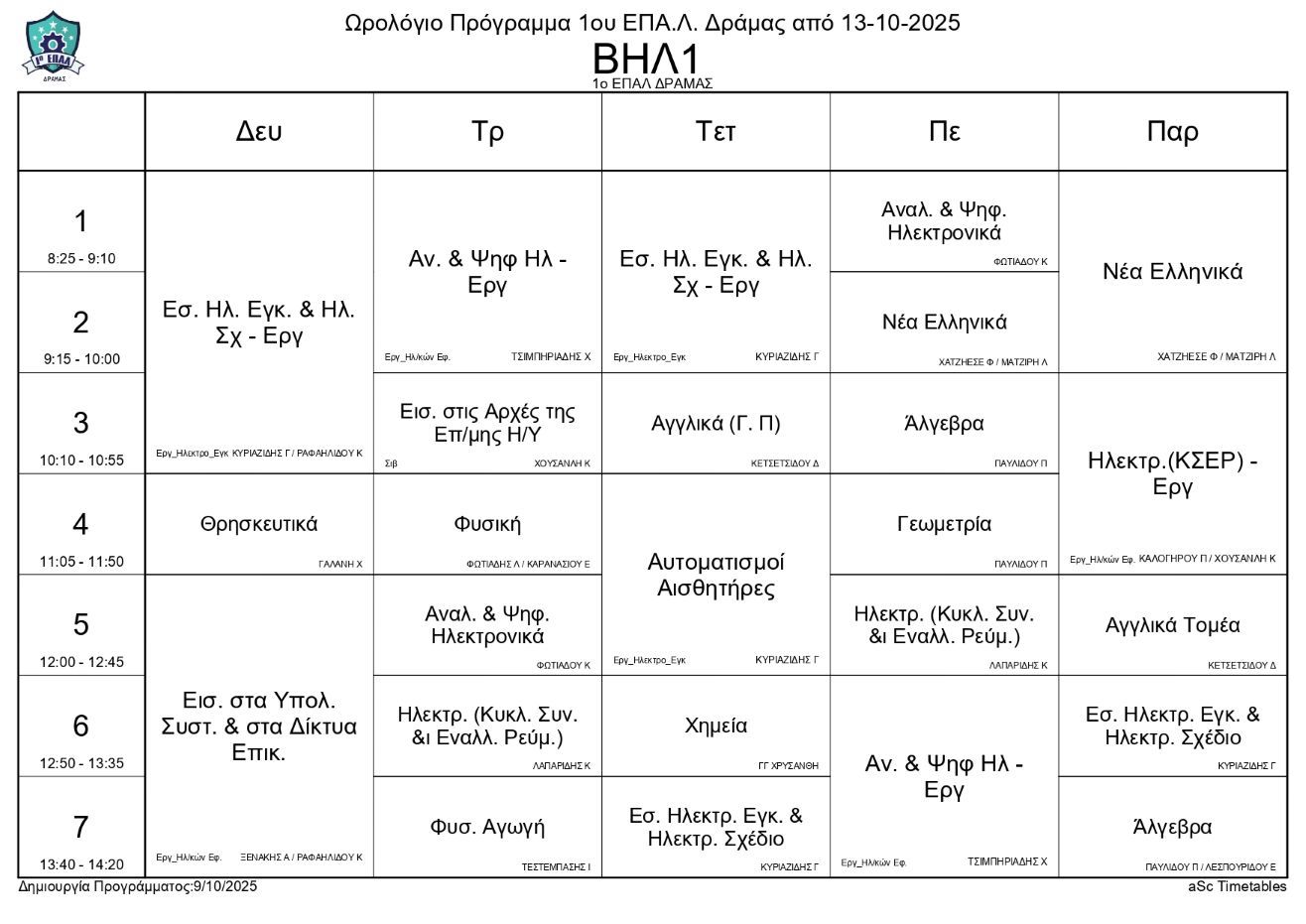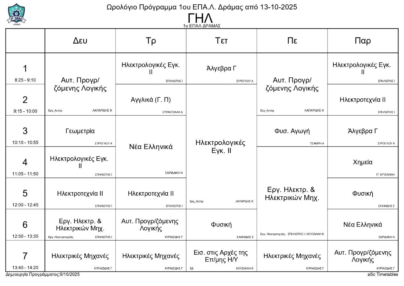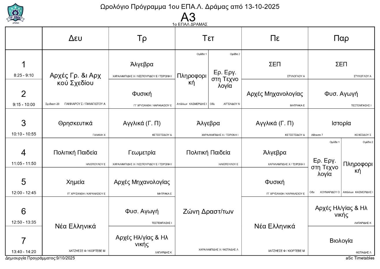 Ωρολόγιο πρόγραμμα λειτουργίας του σχολείου από την Δευτέρα 13-10-2025