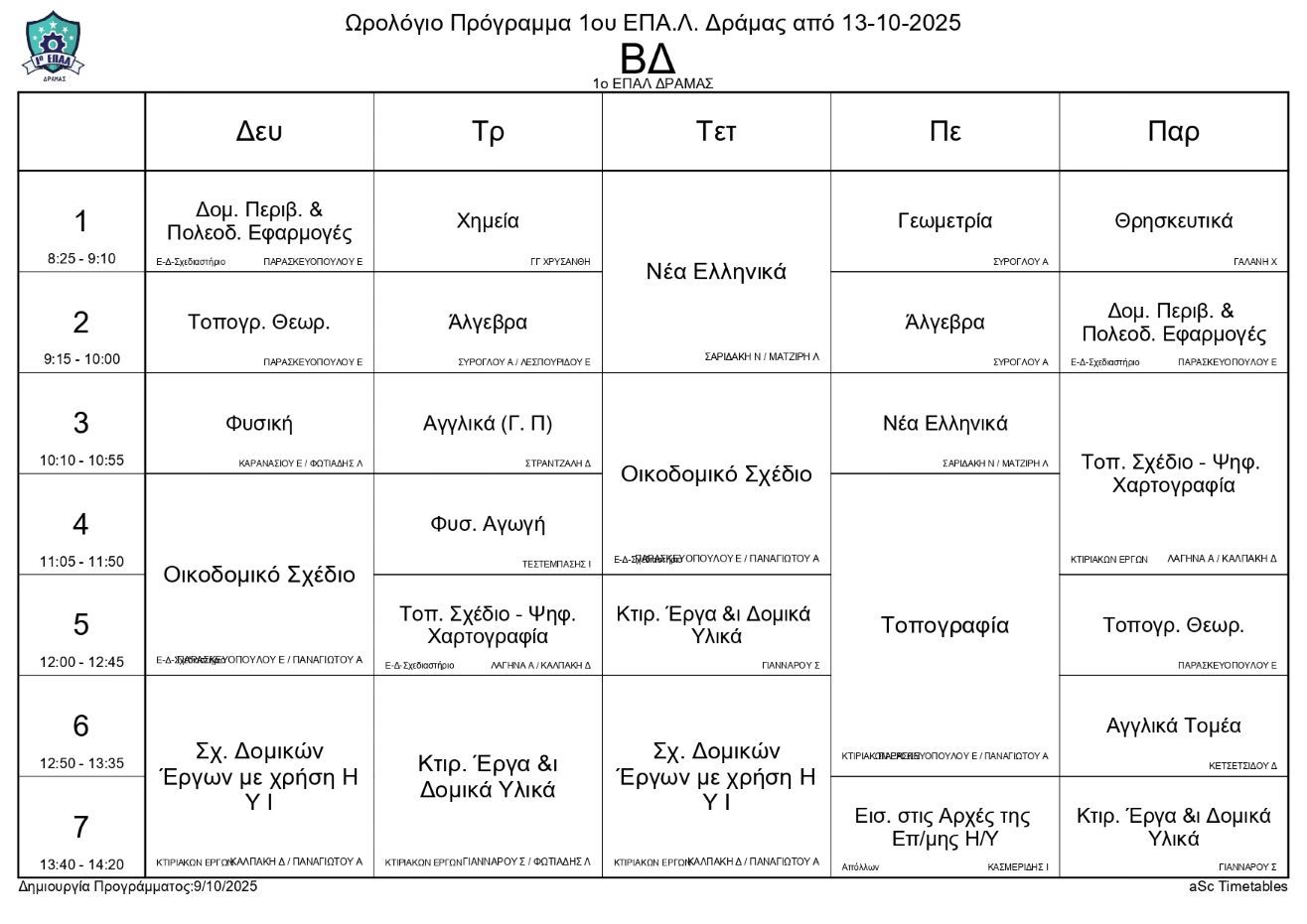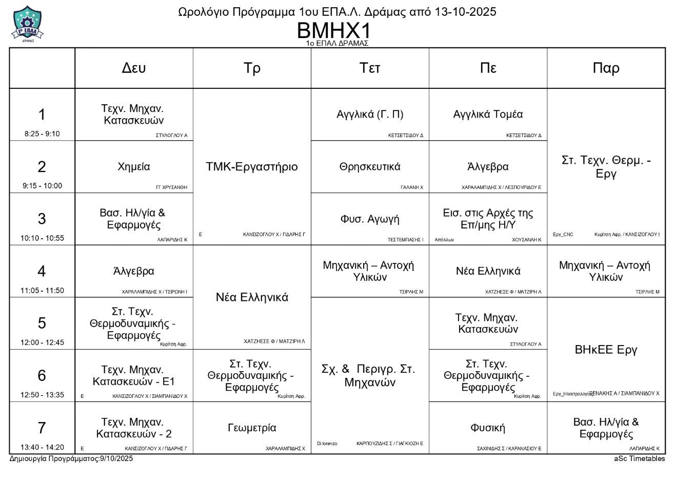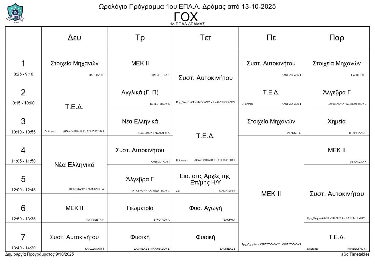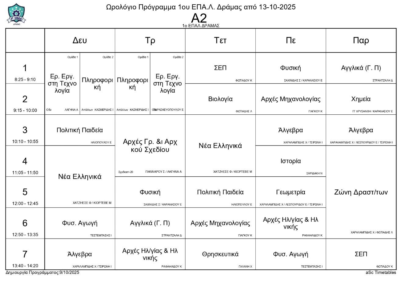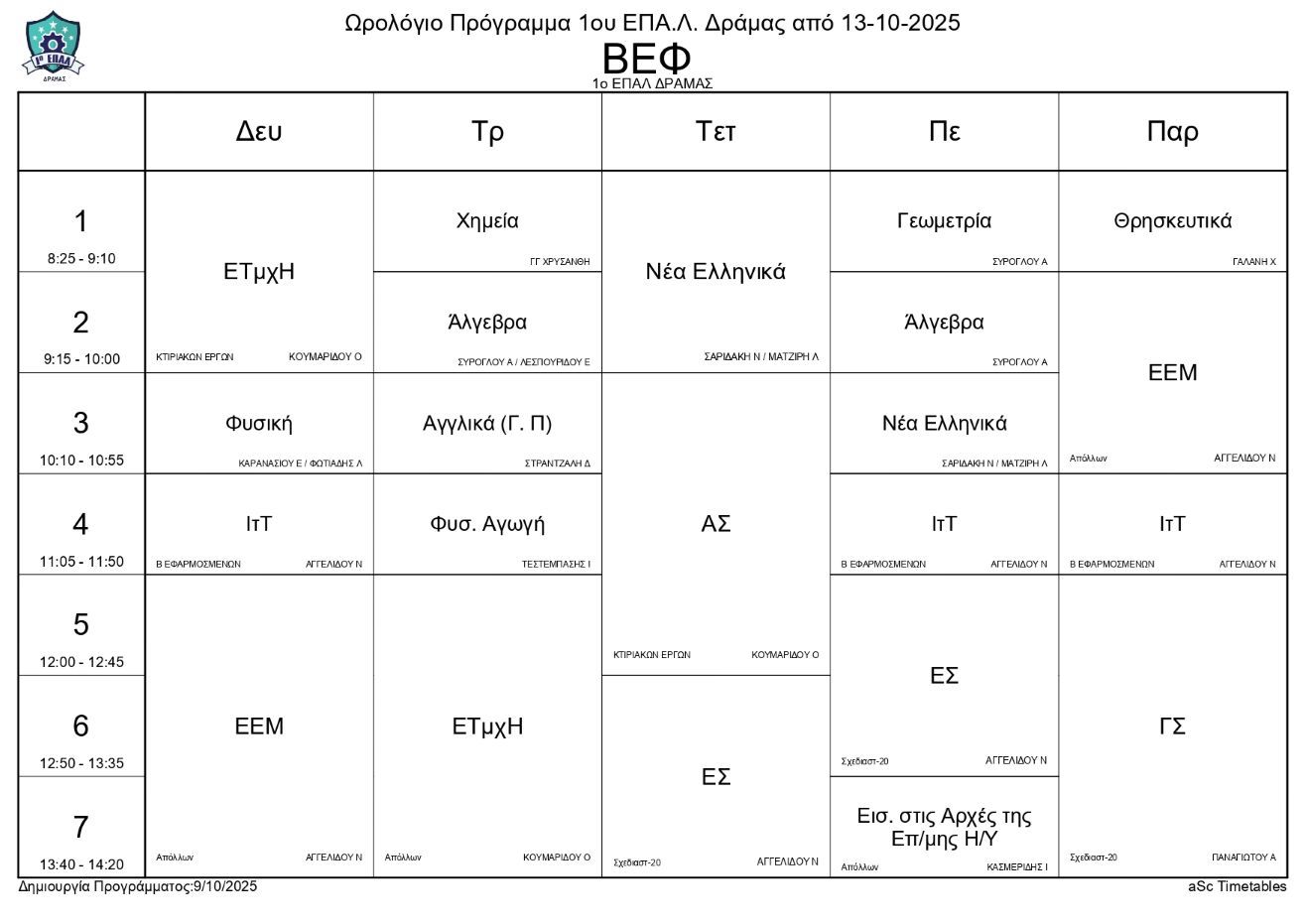 Ωρολόγιο πρόγραμμα λειτουργίας του σχολείου από την Δευτέρα 13-10-2025