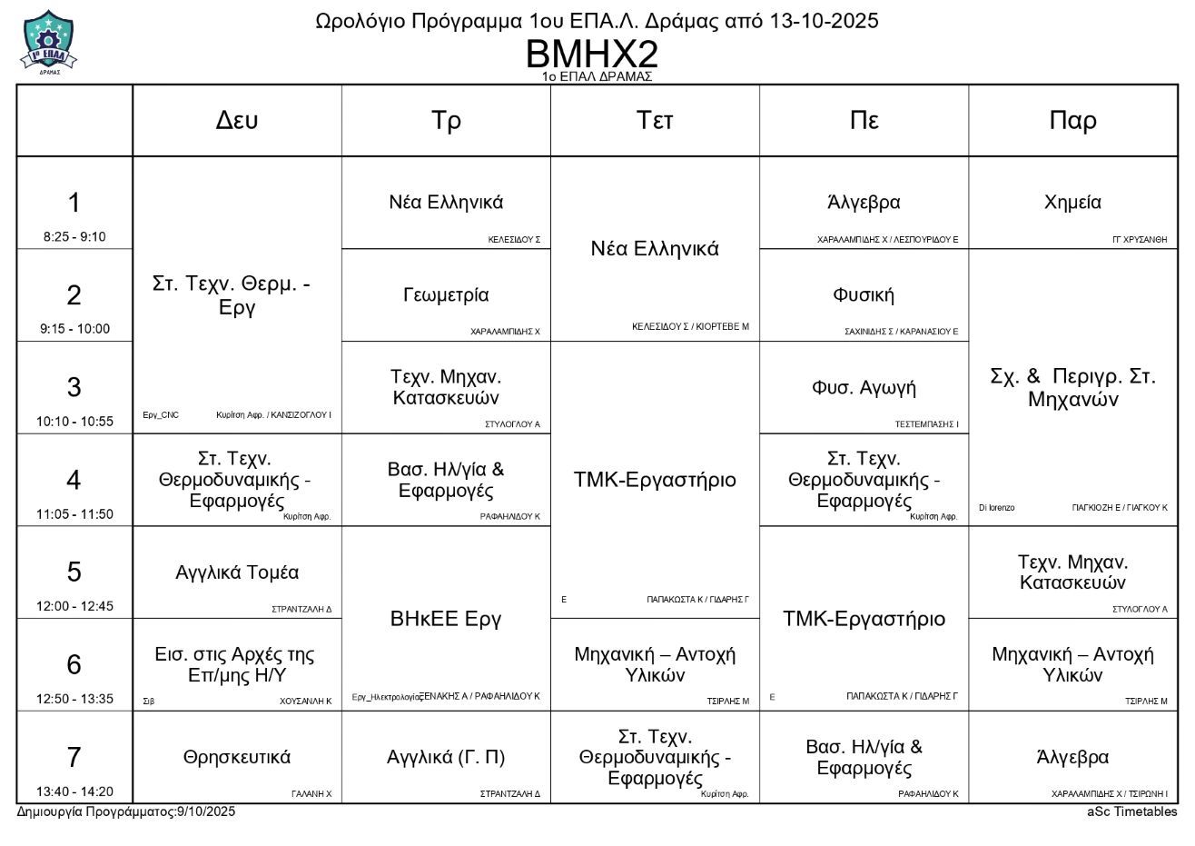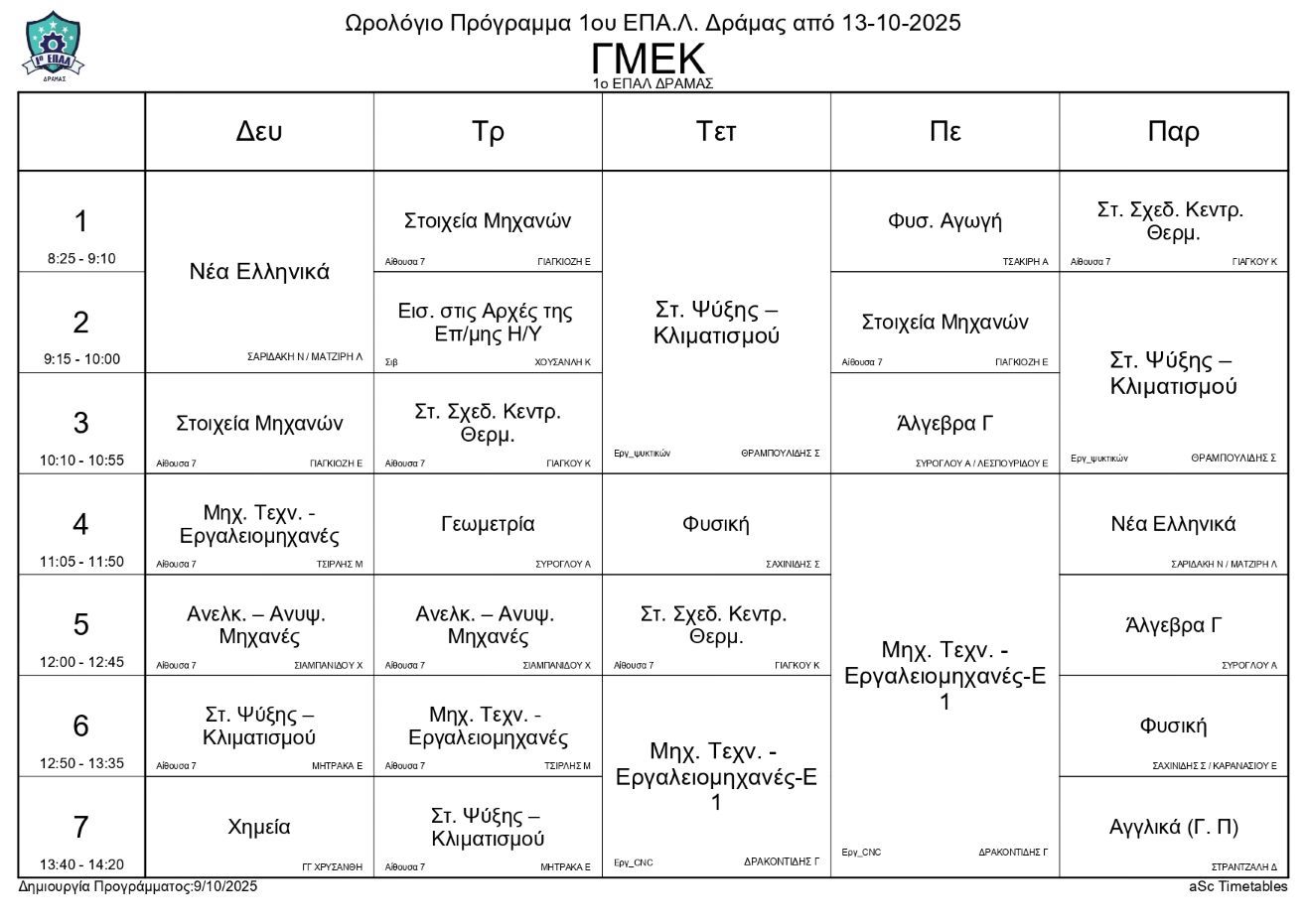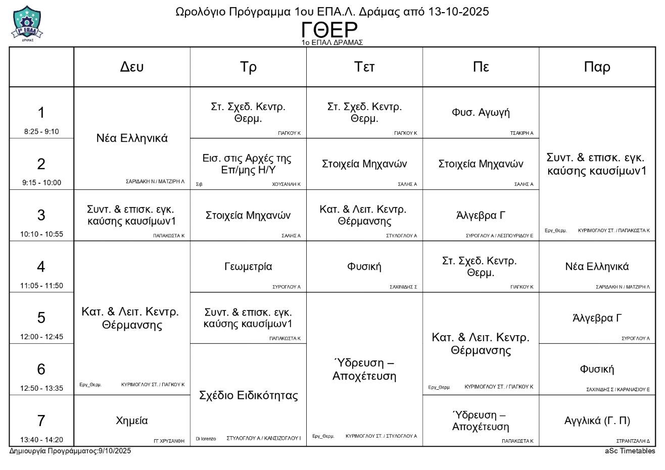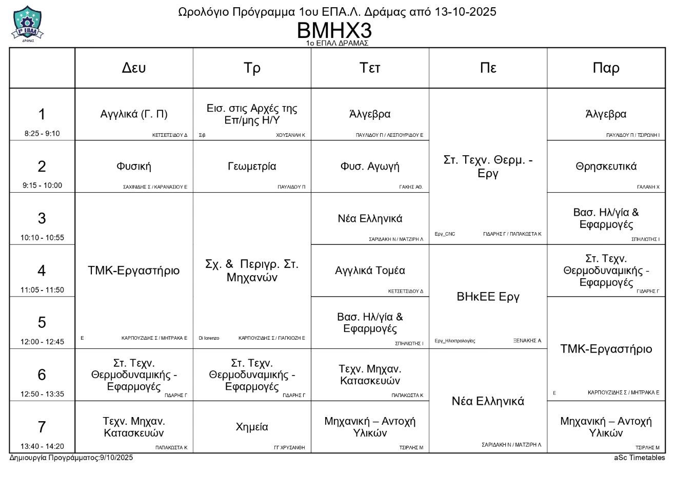 Ωρολόγιο πρόγραμμα λειτουργίας του σχολείου από την Δευτέρα 13-10-2025