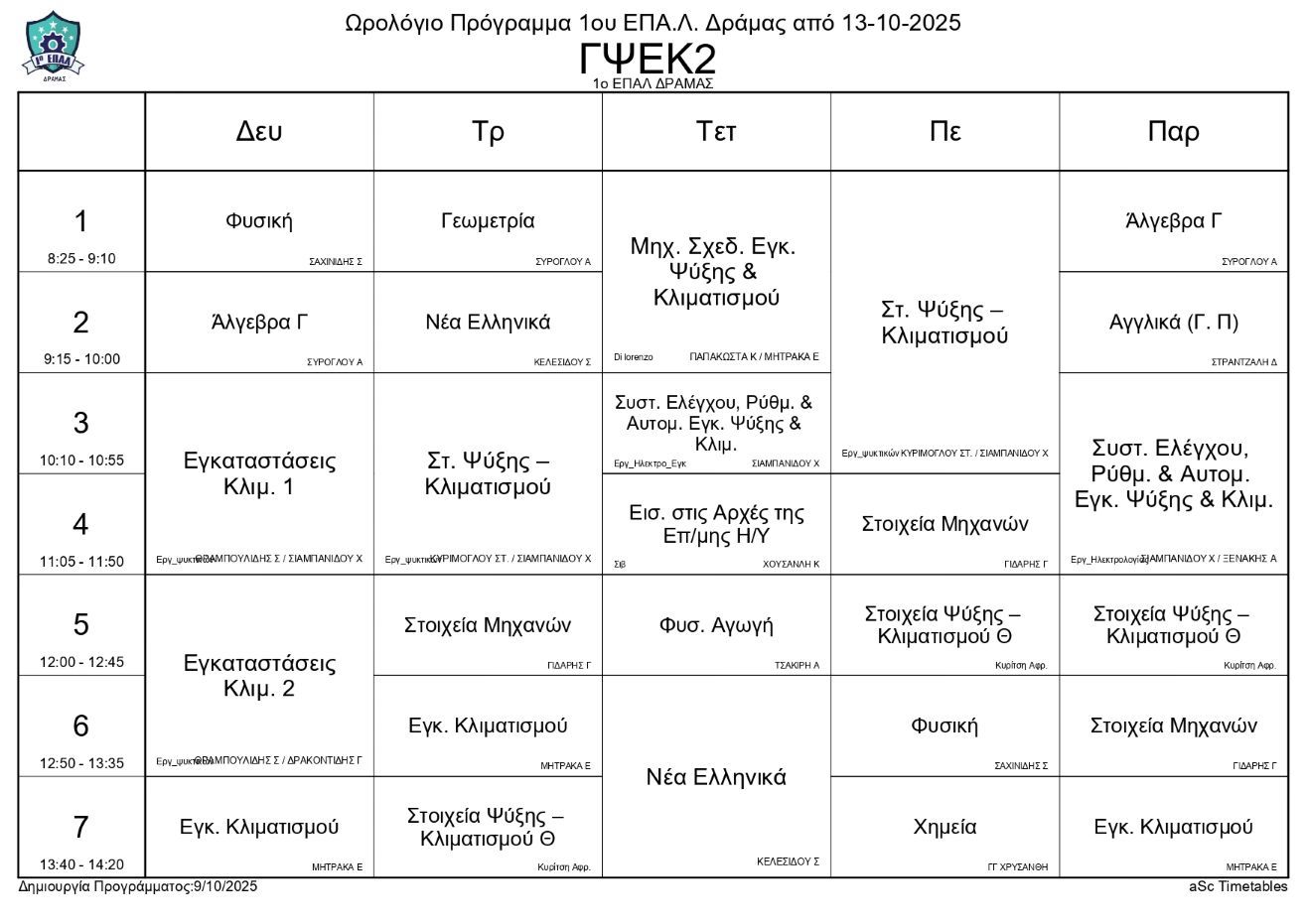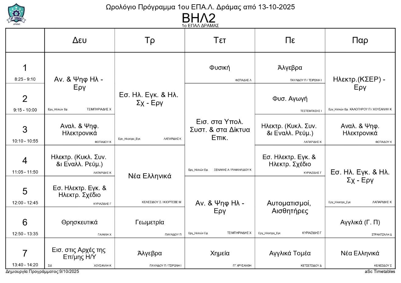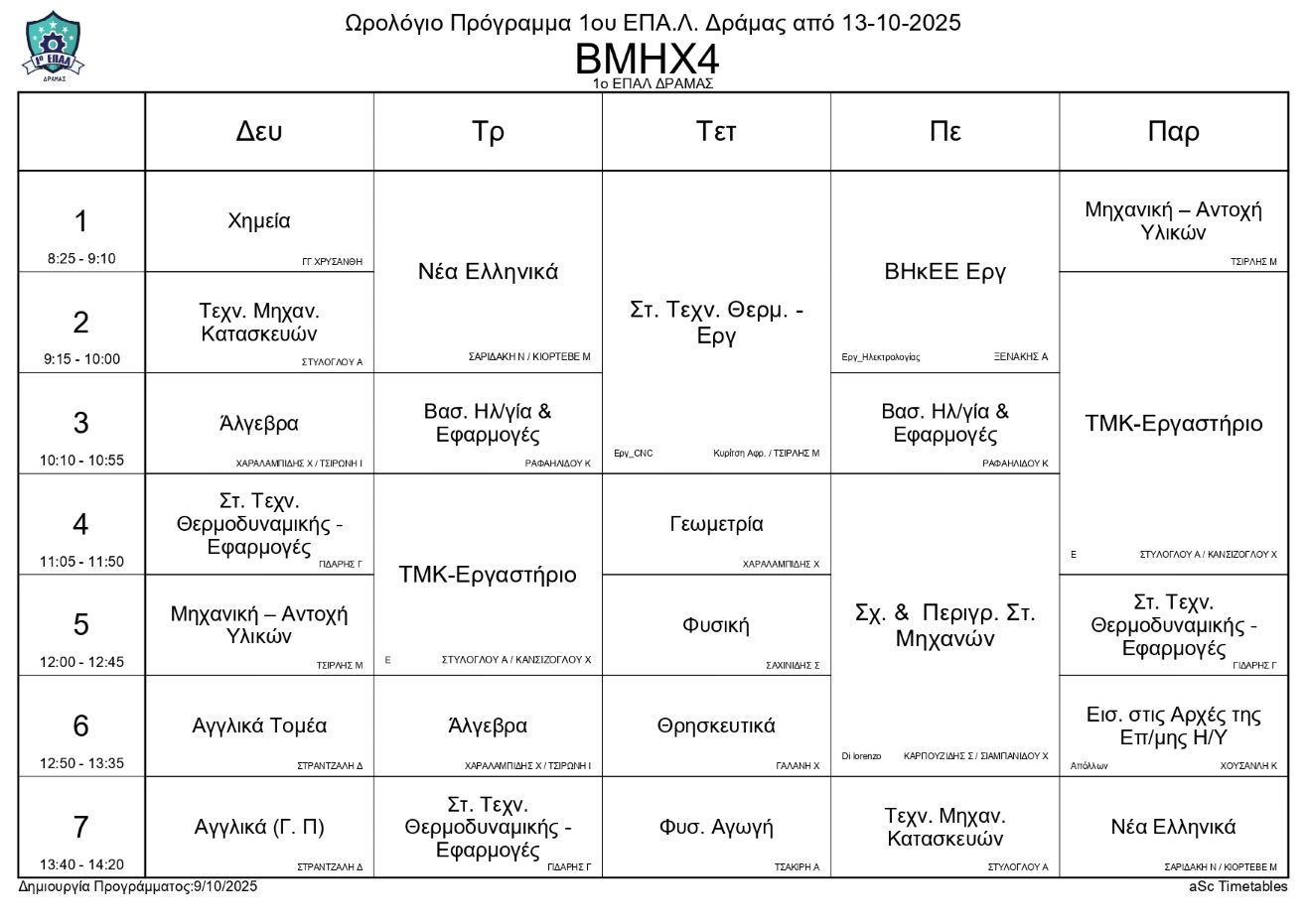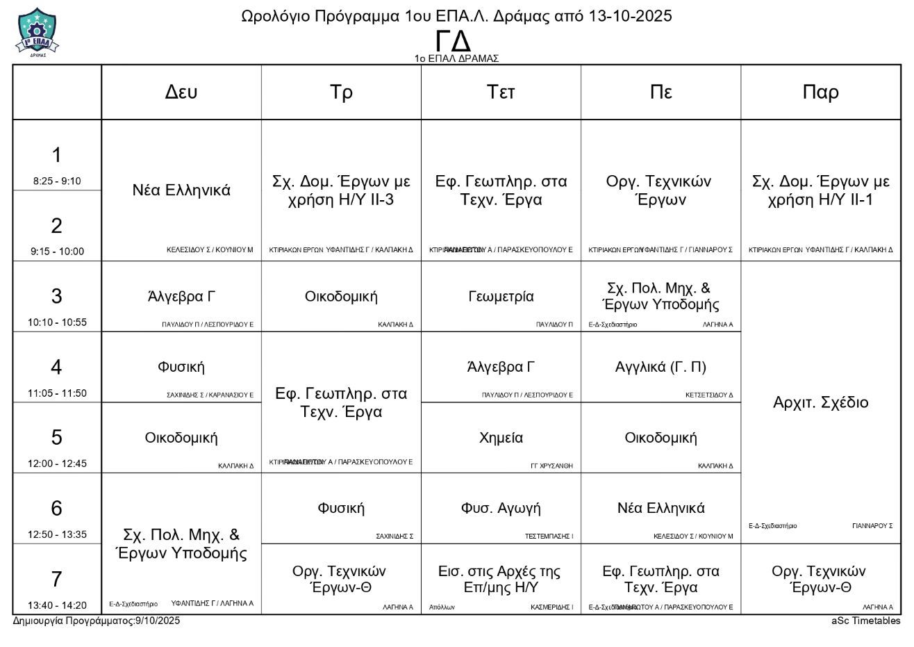 Ωρολόγιο πρόγραμμα λειτουργίας του σχολείου από την Δευτέρα 13-10-2025