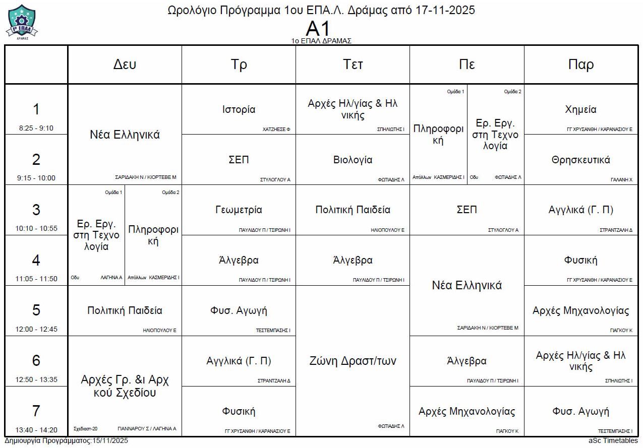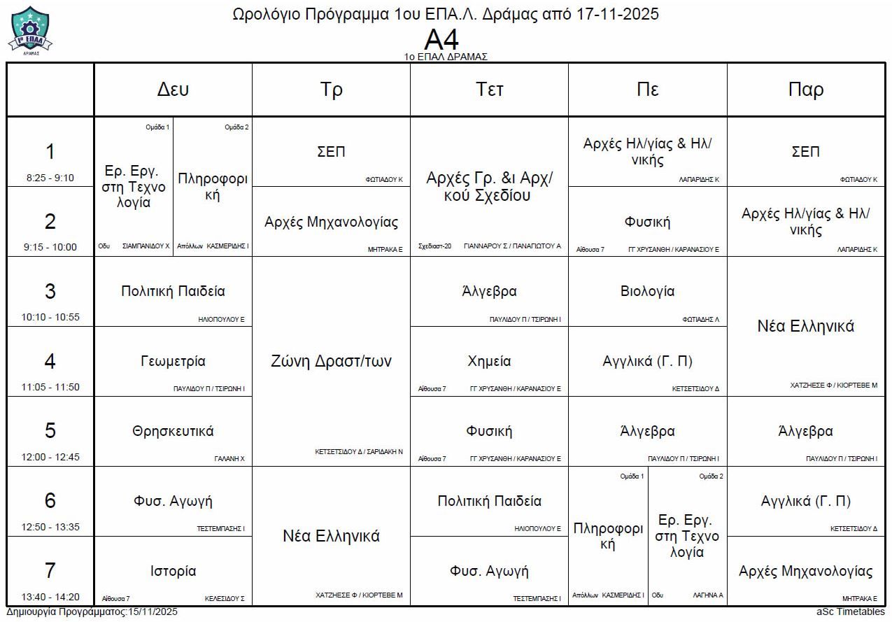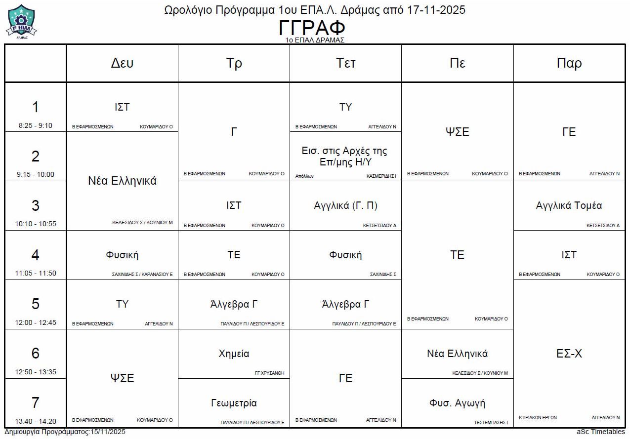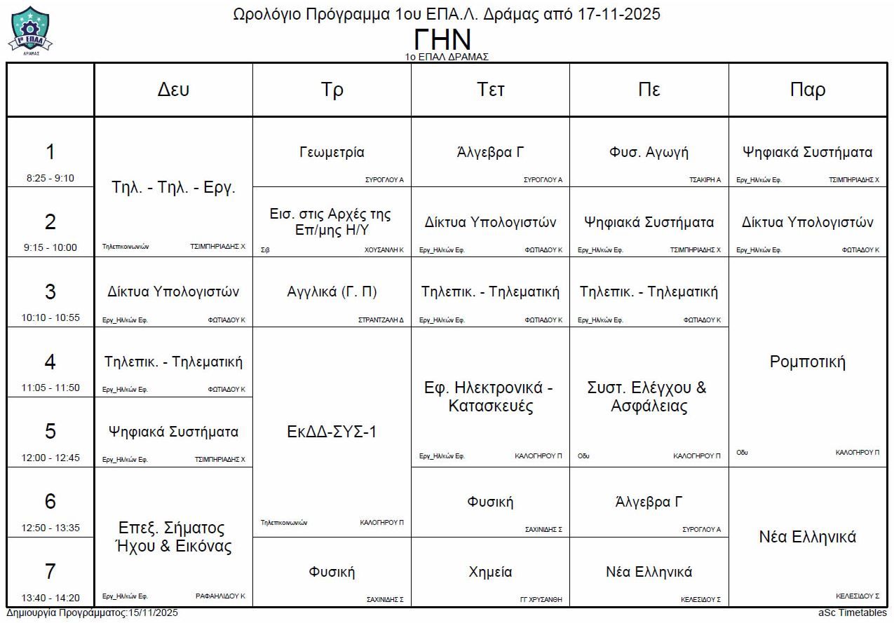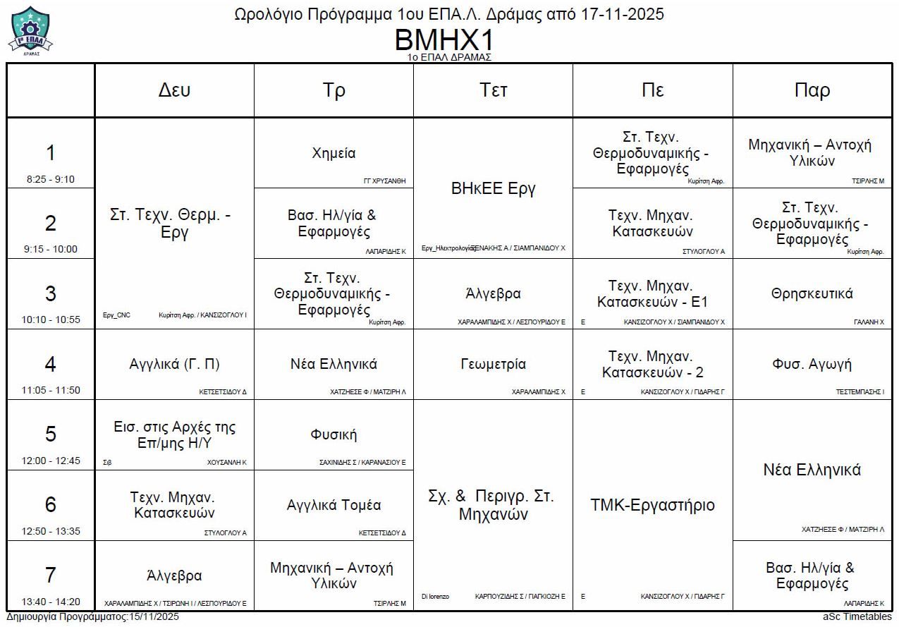 Ωρολόγιο πρόγραμμα λειτουργίας του σχολείου από την Δευτέρα 17-11-2025