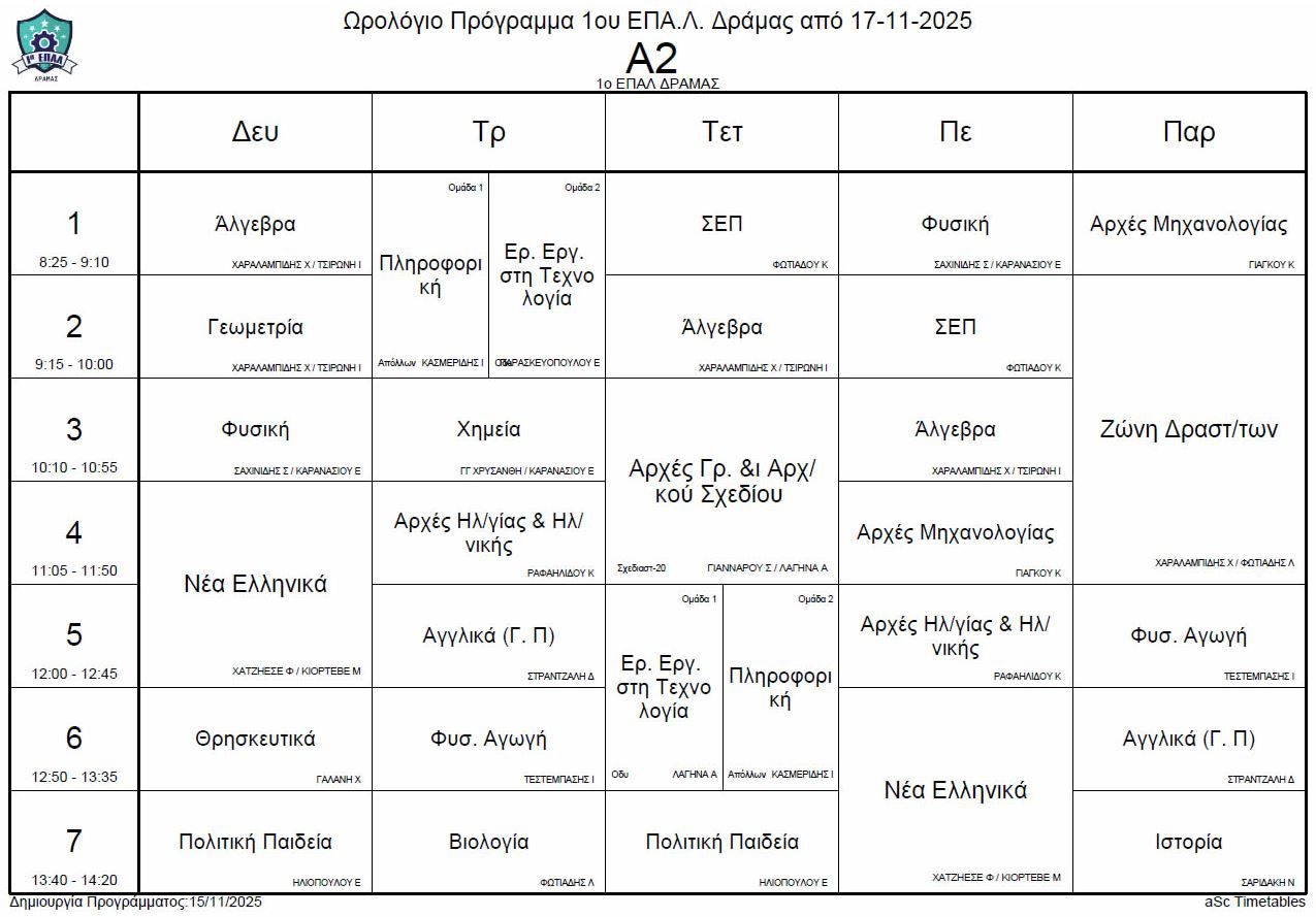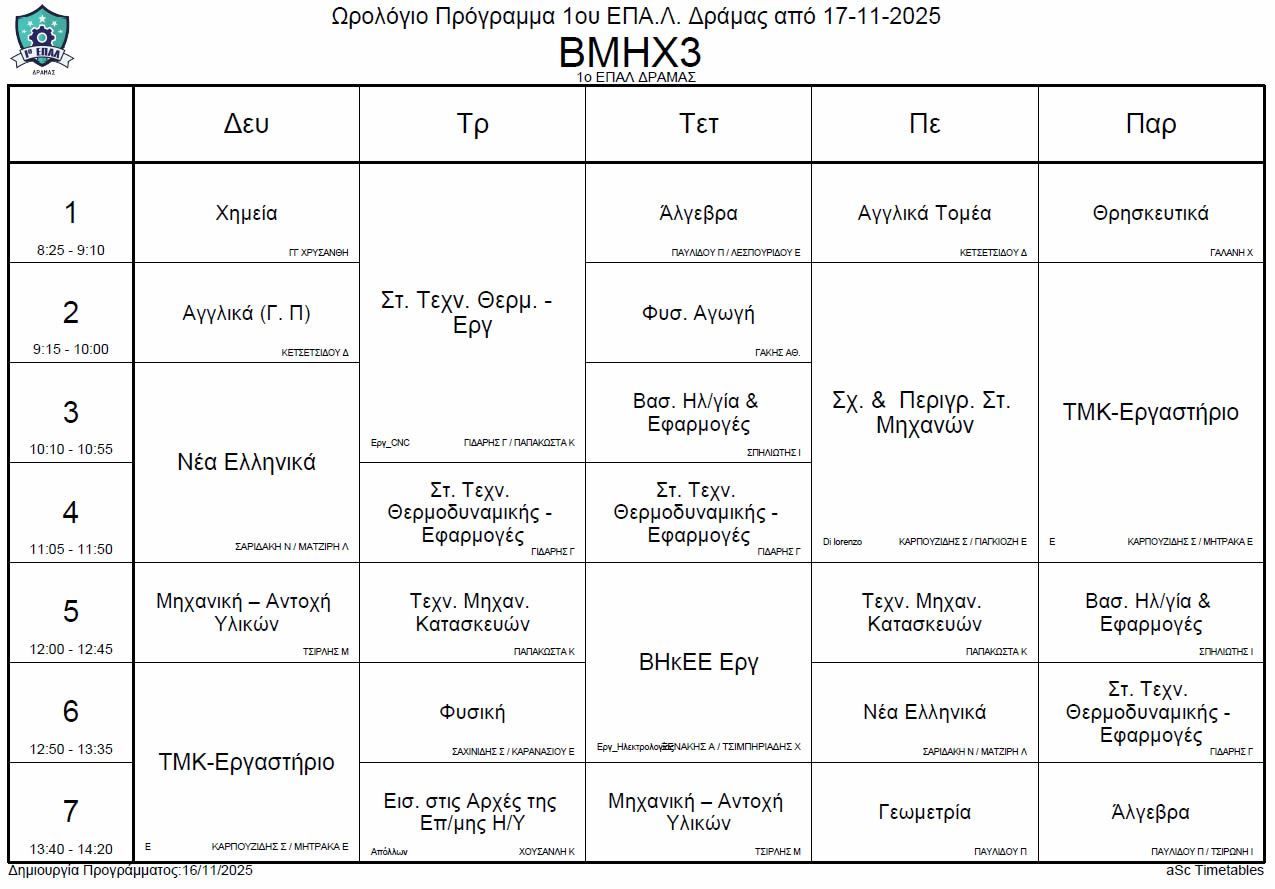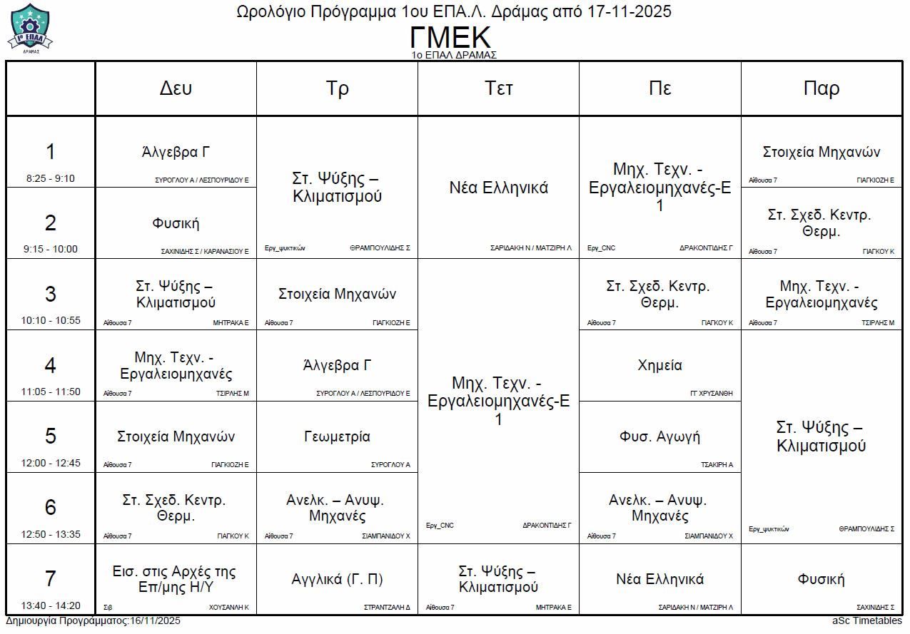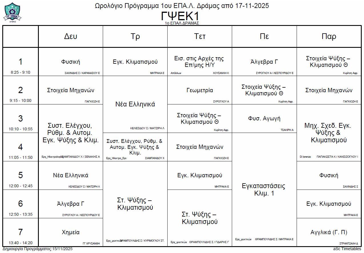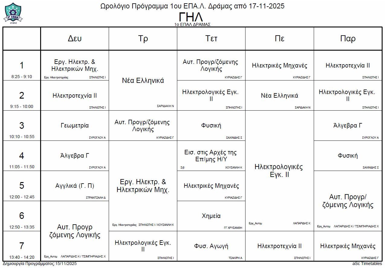 Ωρολόγιο πρόγραμμα λειτουργίας του σχολείου από την Δευτέρα 17-11-2025