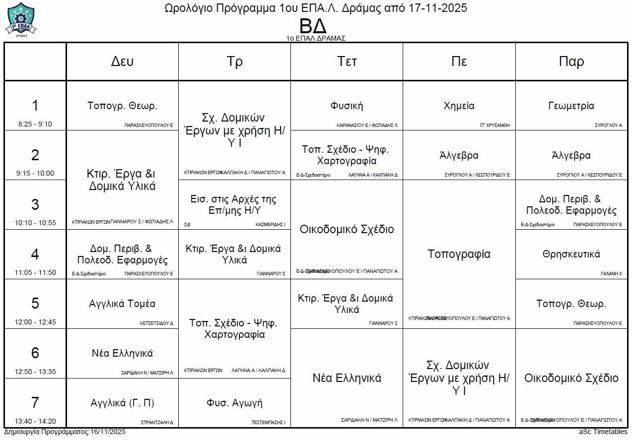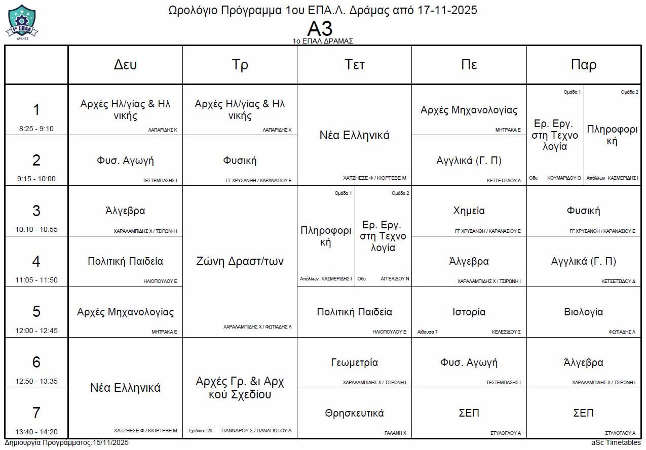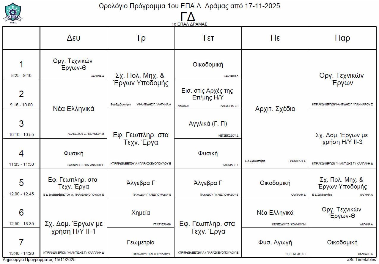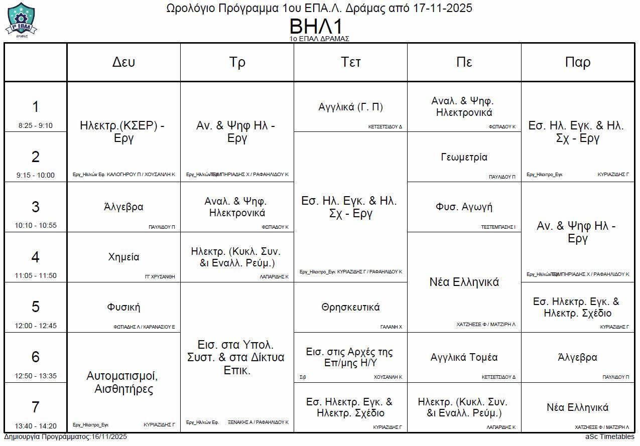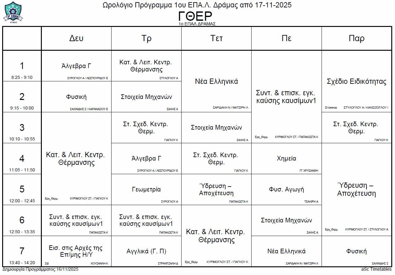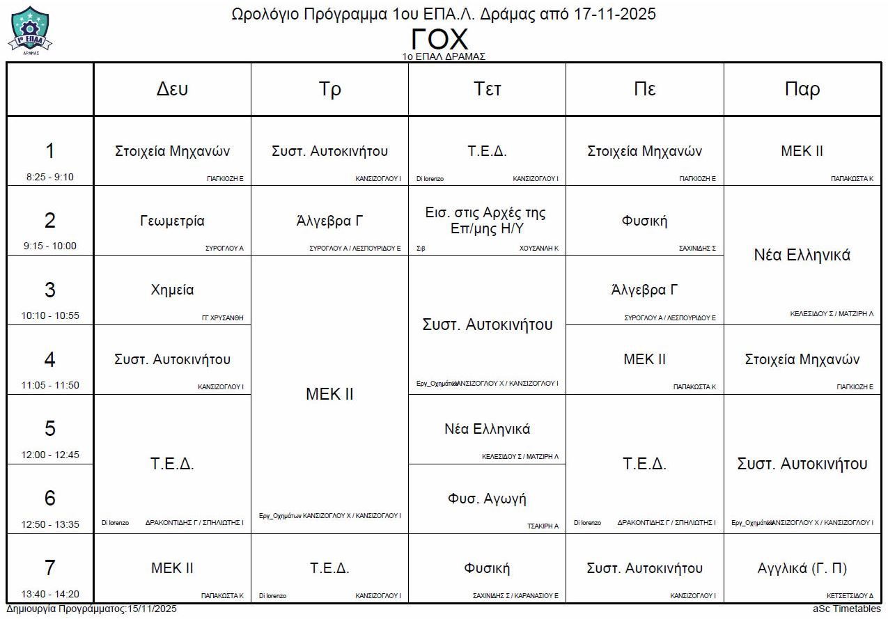 Ωρολόγιο πρόγραμμα λειτουργίας του σχολείου από την Δευτέρα 17-11-2025
