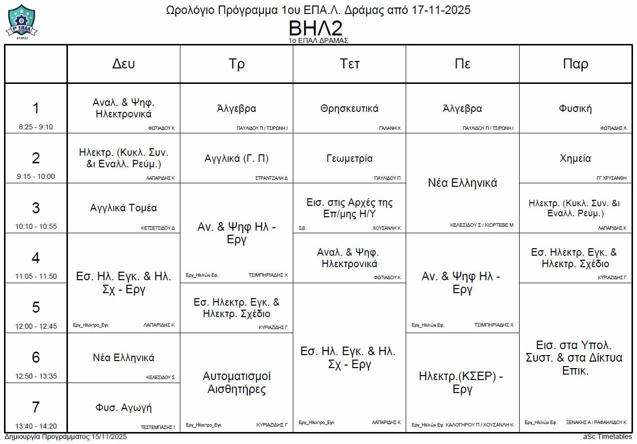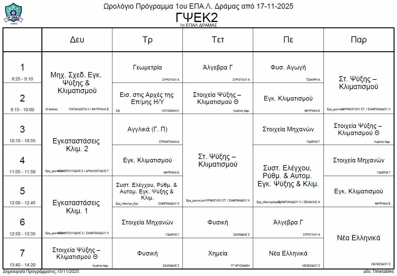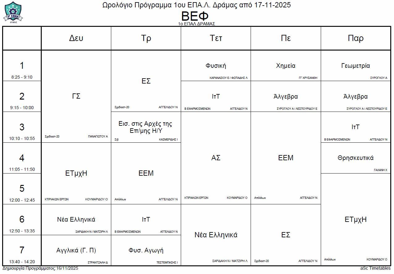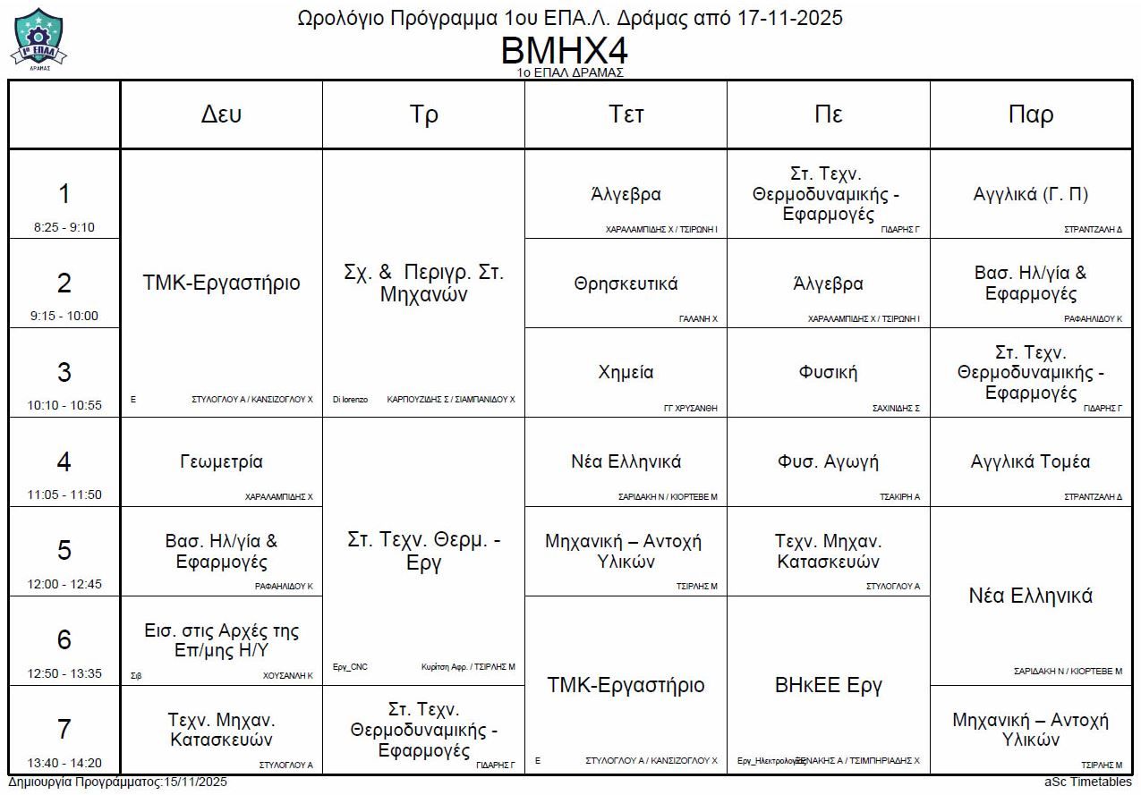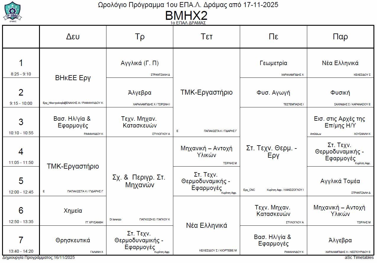 Ωρολόγιο πρόγραμμα λειτουργίας του σχολείου από την Δευτέρα 17-11-2025