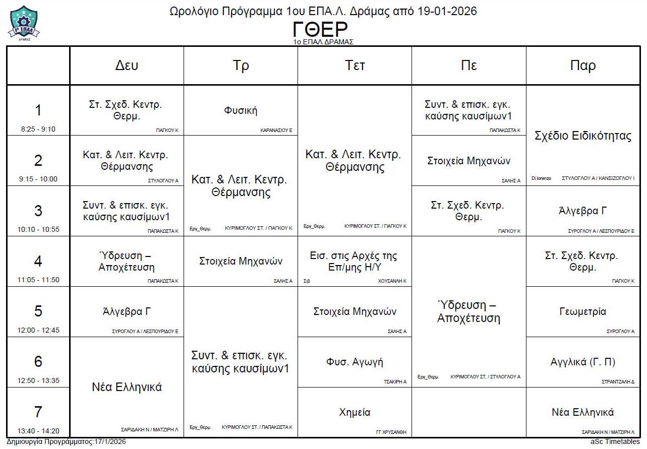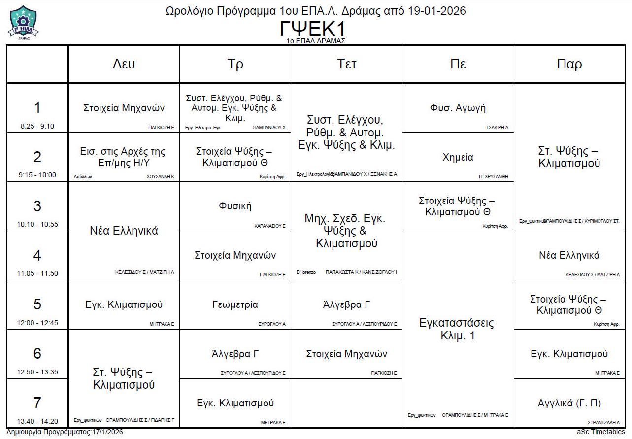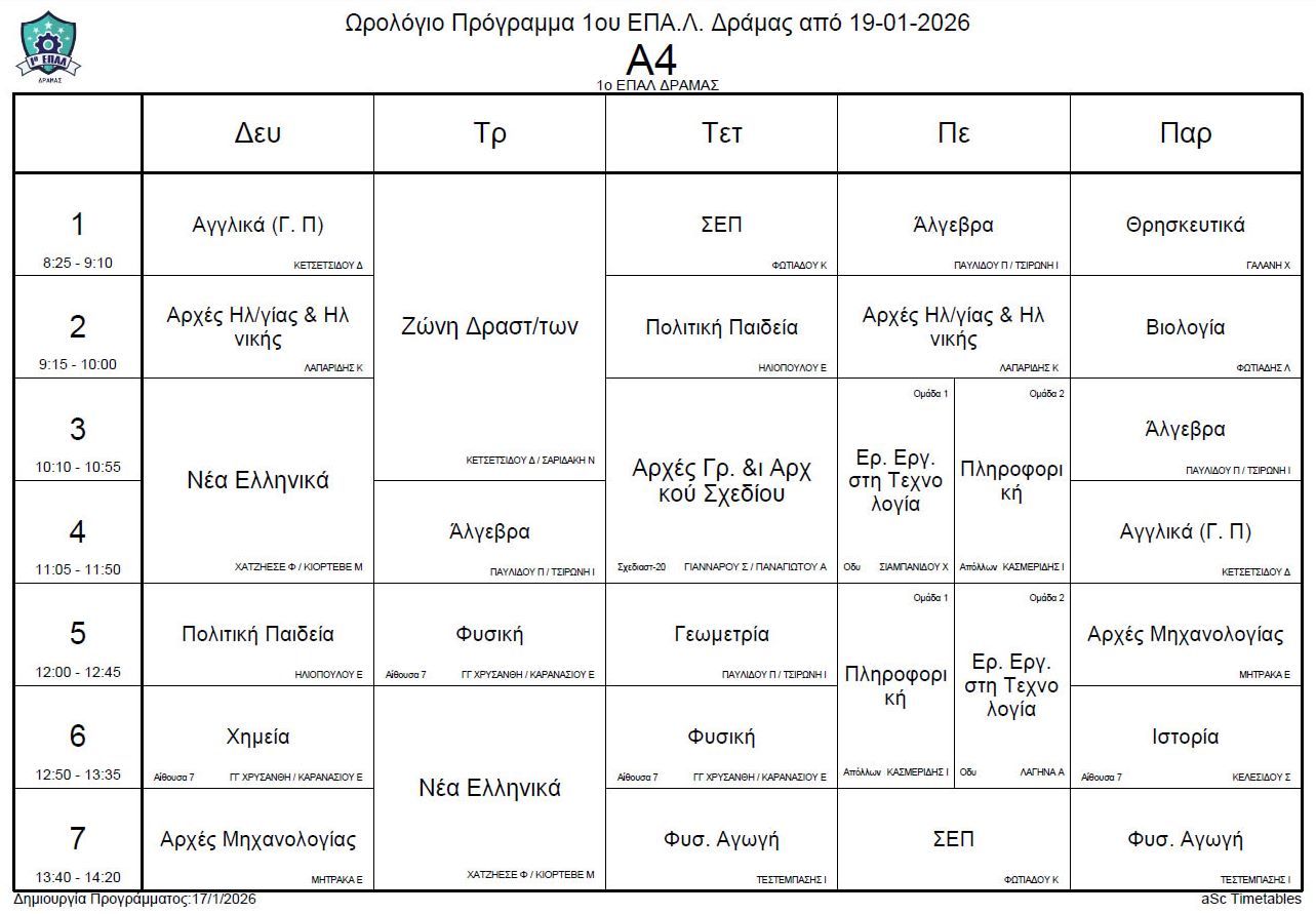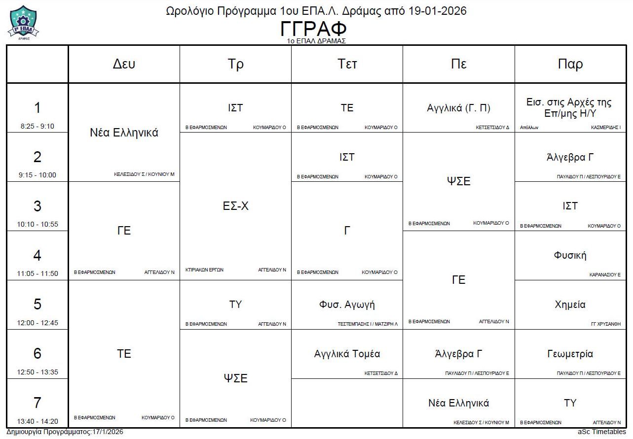 Ωρολόγιο πρόγραμμα λειτουργίας του σχολείου από την Δευτέρα 19-01-2026