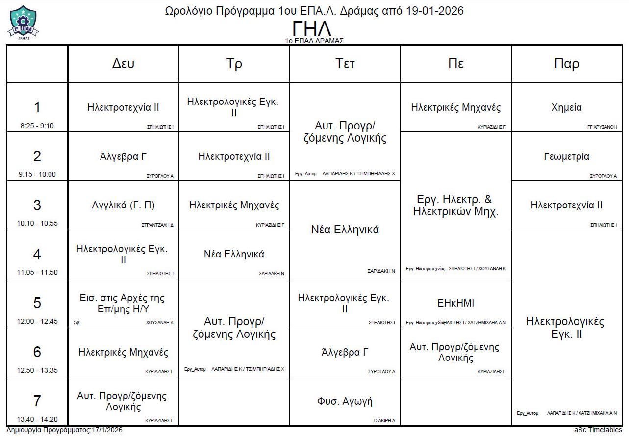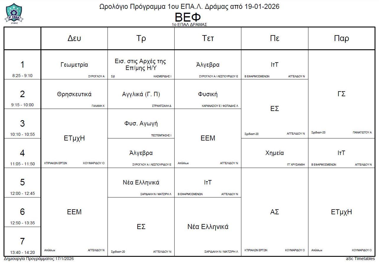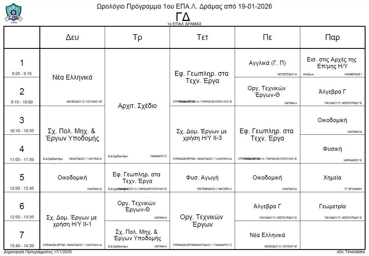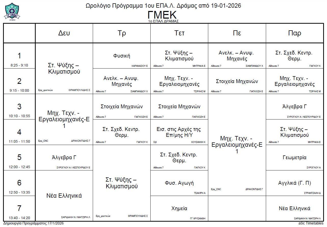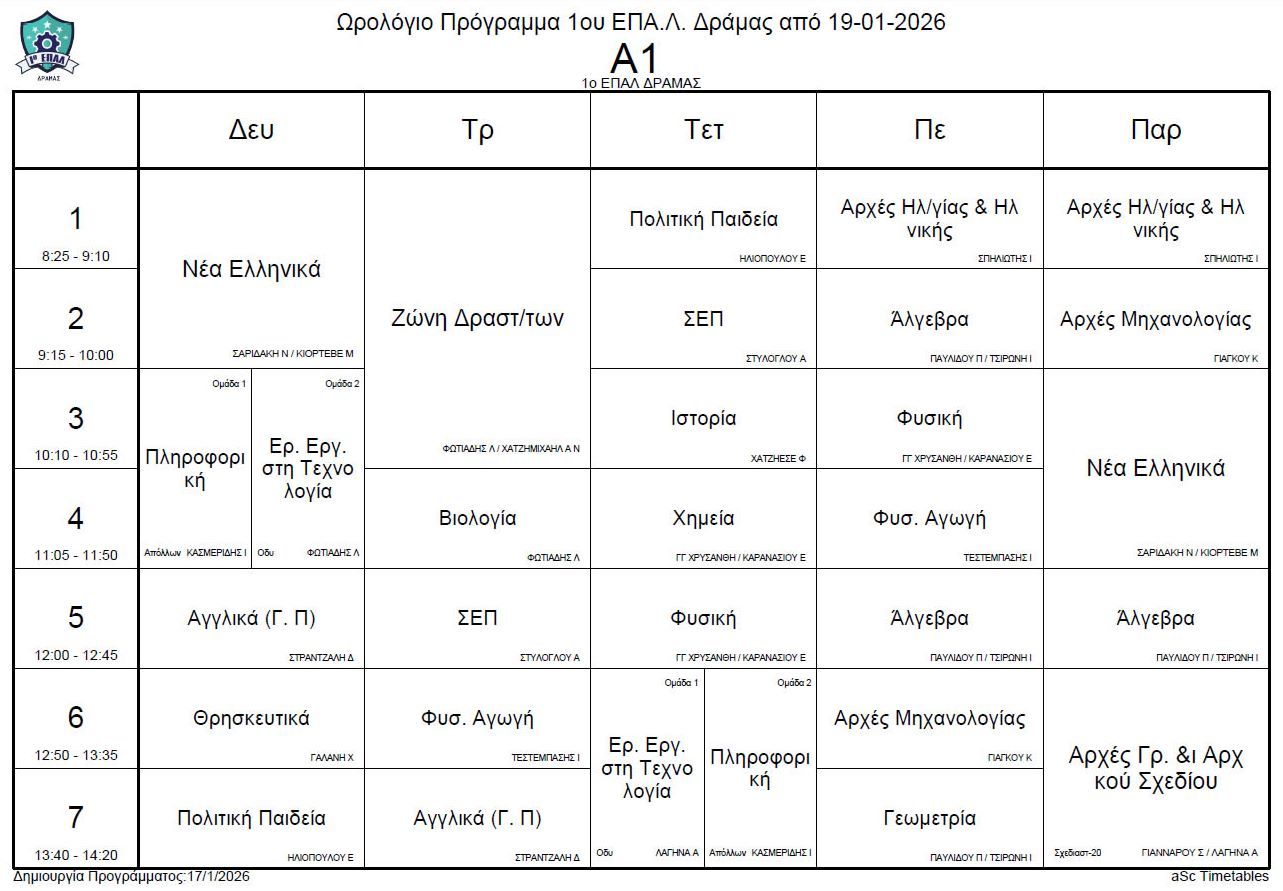 Ωρολόγιο πρόγραμμα λειτουργίας του σχολείου από την Δευτέρα 19-01-2026