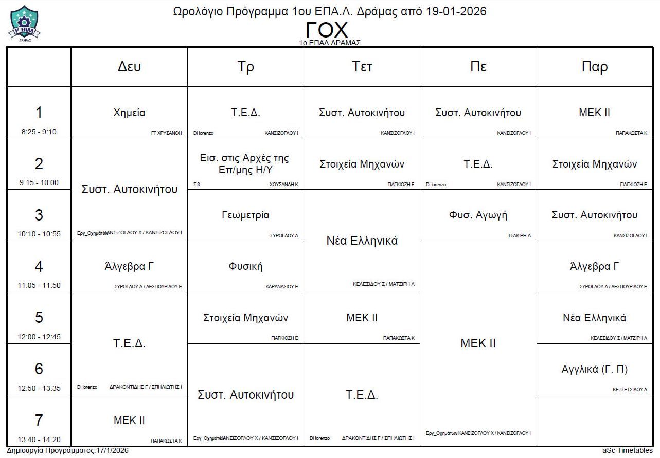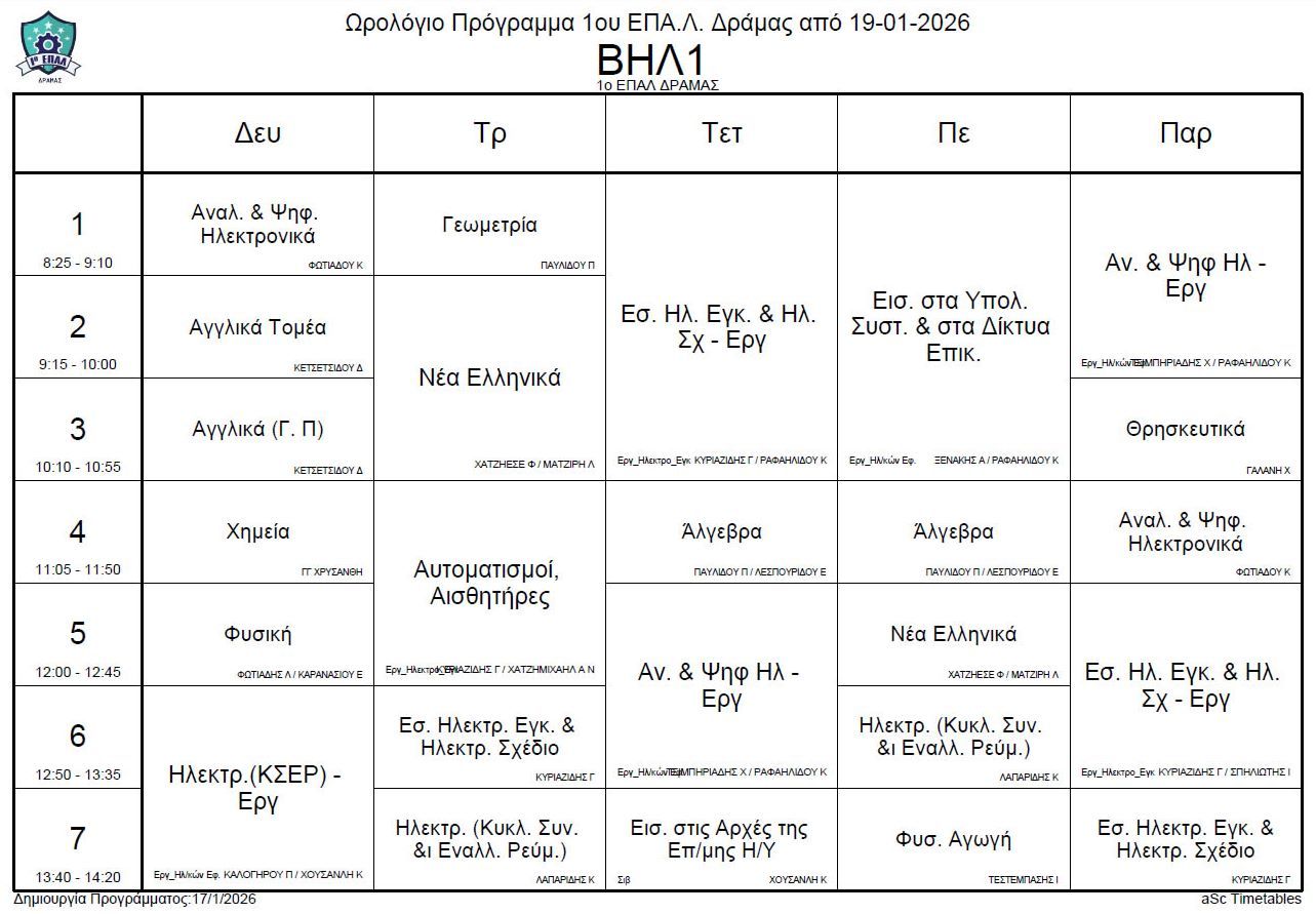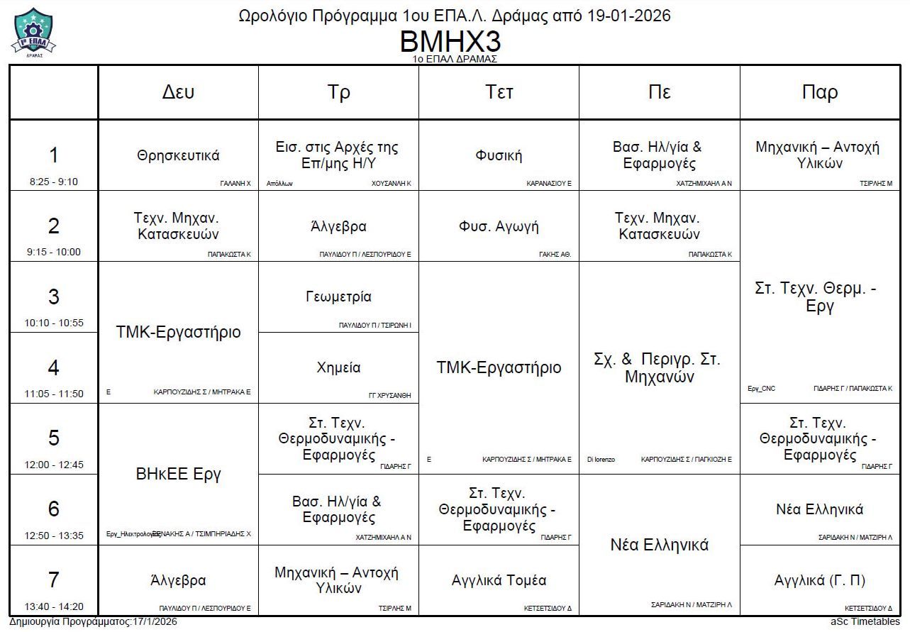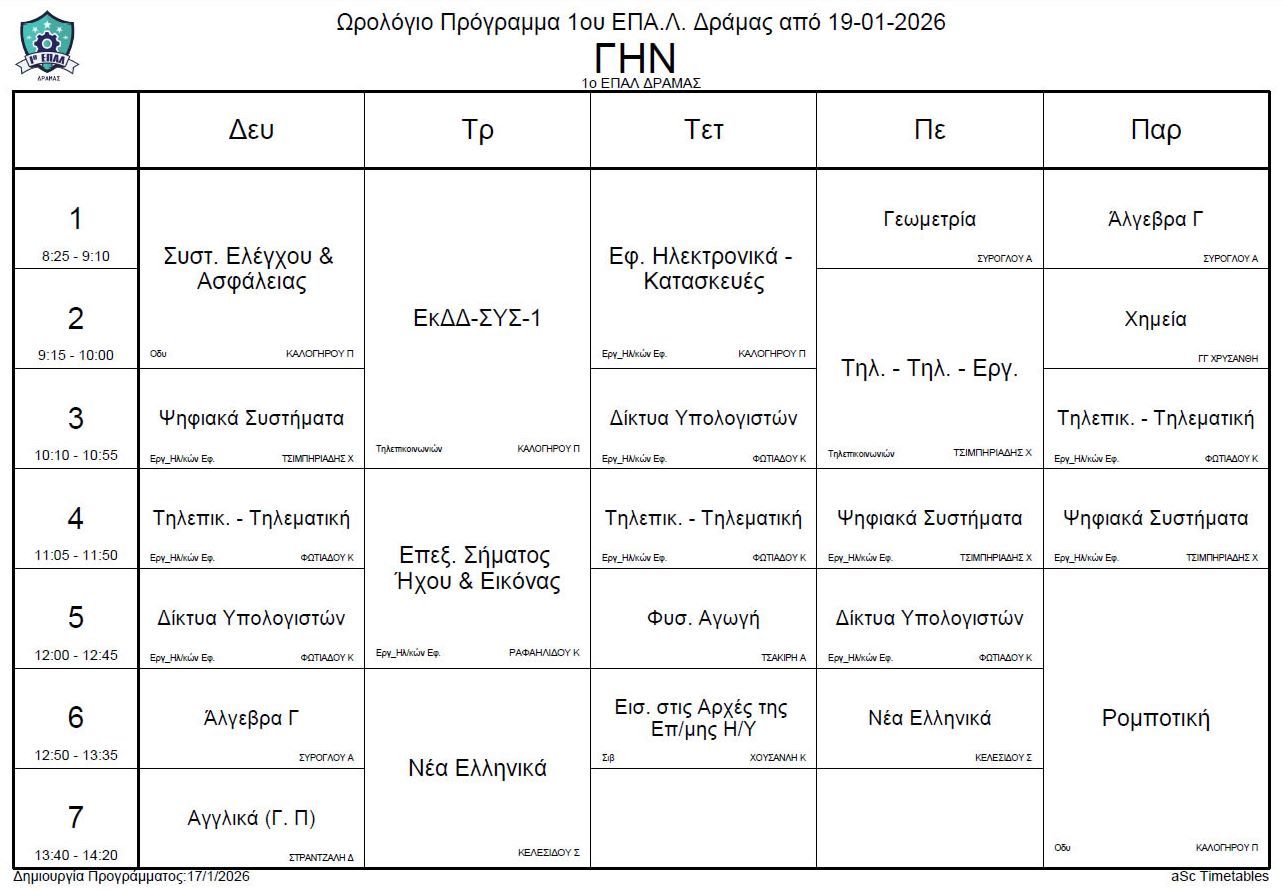 Ωρολόγιο πρόγραμμα λειτουργίας του σχολείου από την Δευτέρα 19-01-2026