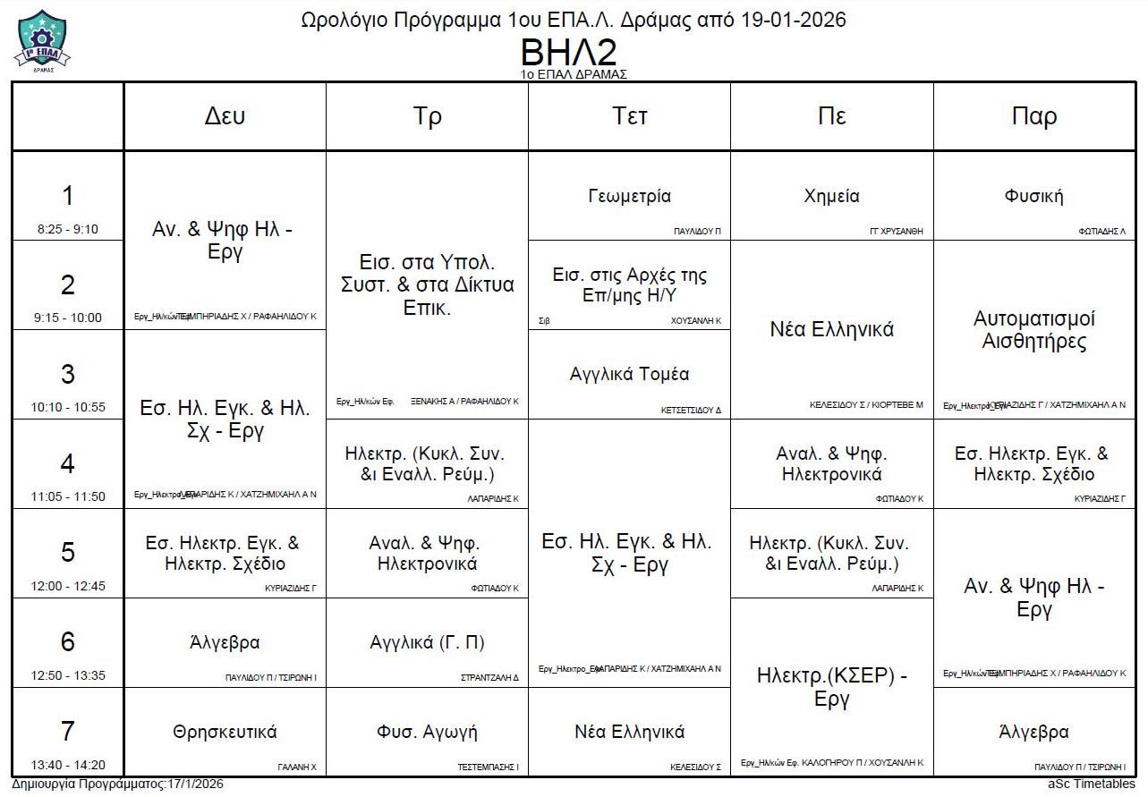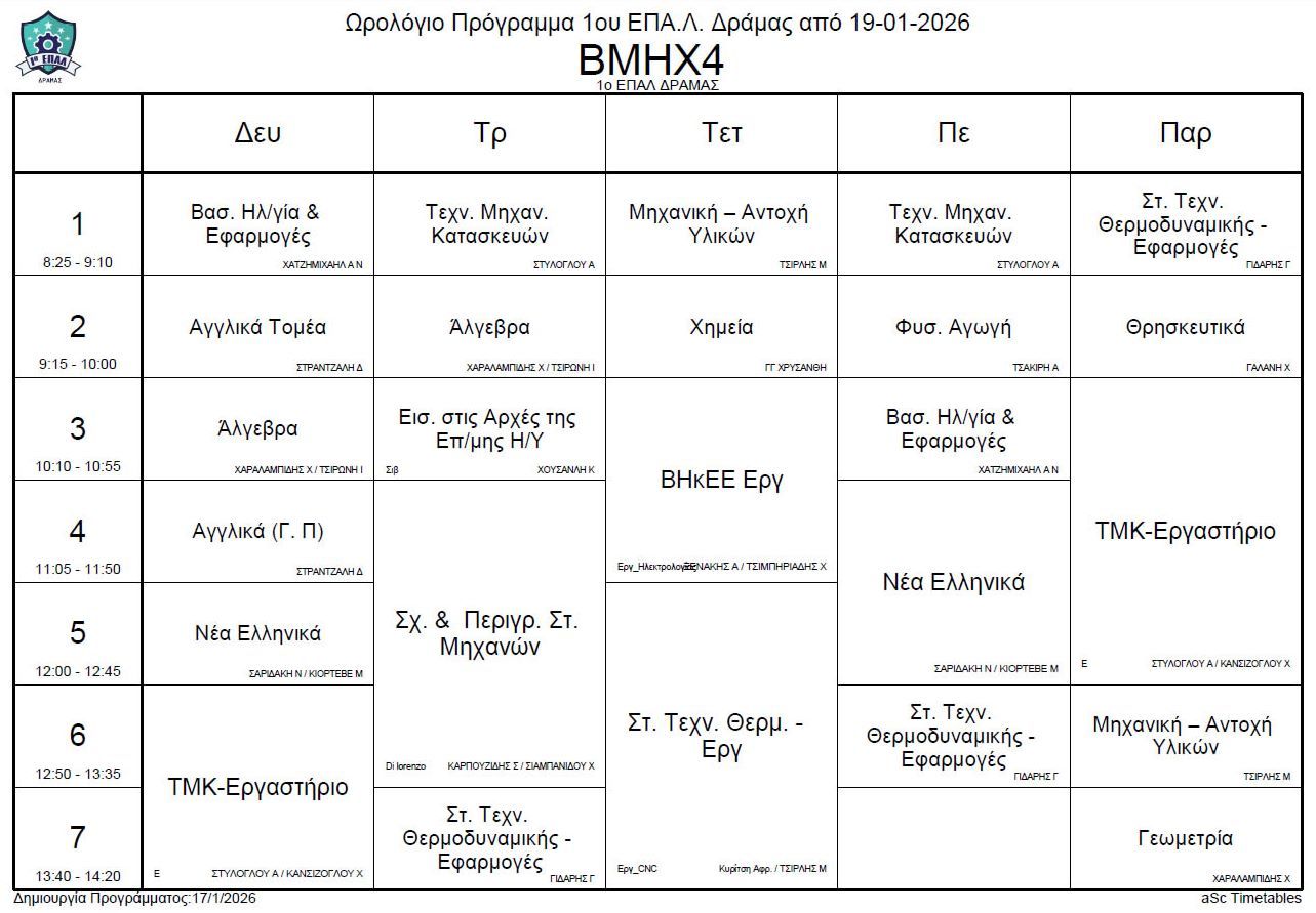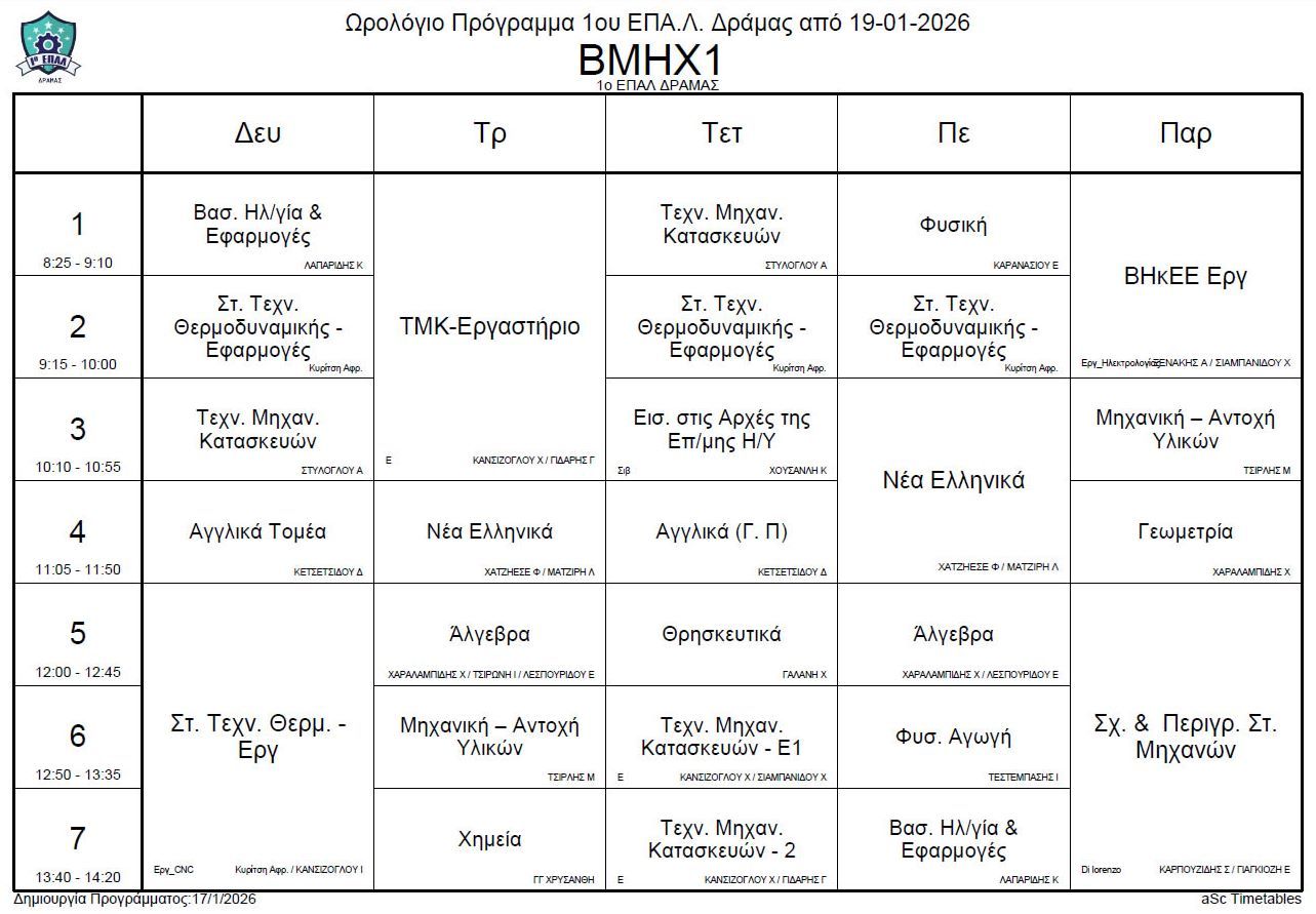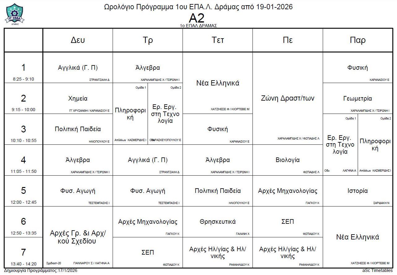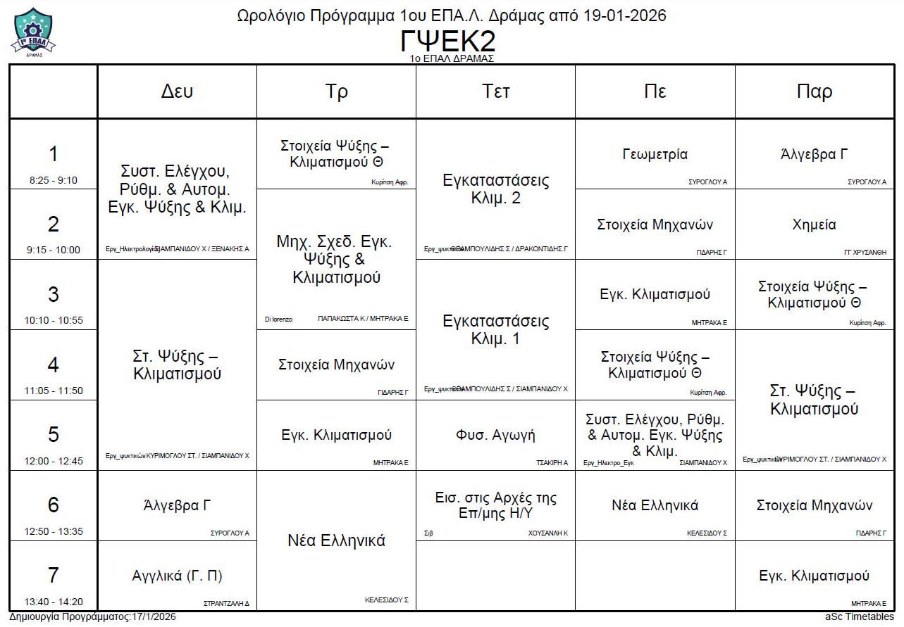 Ωρολόγιο πρόγραμμα λειτουργίας του σχολείου από την Δευτέρα 19-01-2026