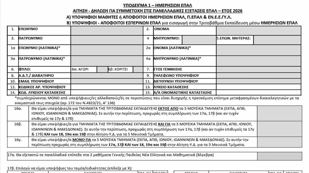 Υποβολή Αίτησης–Δήλωσης για συμμετοχή στις Πανελλαδικές Εξετάσεις των ΓΕΛ ή ΕΠΑΛ έτους 2026