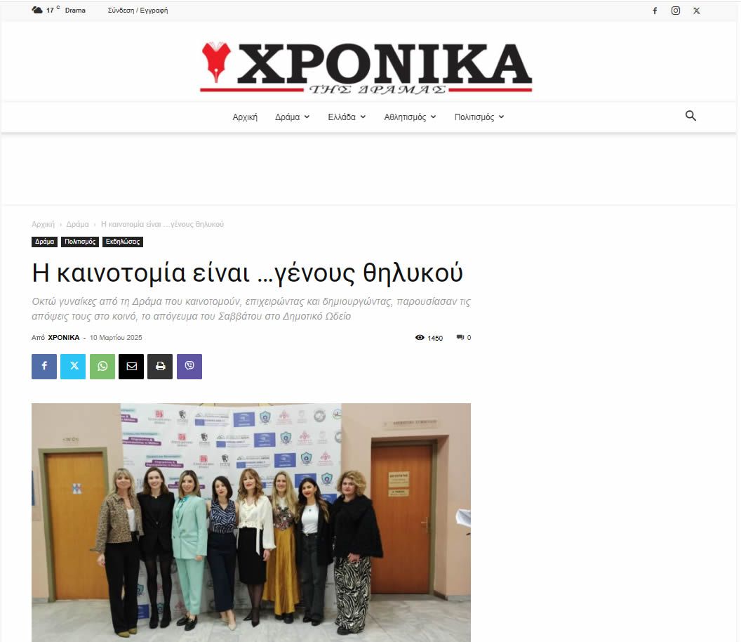 Η εκδήλωση «Γυναίκες που Καινοτομούν, Επιχειρώντας & Δημιουργώντας το Μέλλον» πραγματοποιήθηκε το Σάββατο 8 Μαρτίου 2025, στο Δημοτικό Ωδείο Δράμας, με στόχο να αναδείξει τον ρόλο των γυναικών στην καινοτομία και την επιχειρηματικότητα. Οκτώ καταξιωμένες επιχειρηματίες της Δράμας μοιράστηκαν τις εμπειρίες τους, ενώ μαθητές του προγράμματος Πρέσβεις του Ευρωπαϊκού Κοινοβουλίου του 1ου ΕΠΑΛ Δράμας συντόνισαν τη συζήτηση.