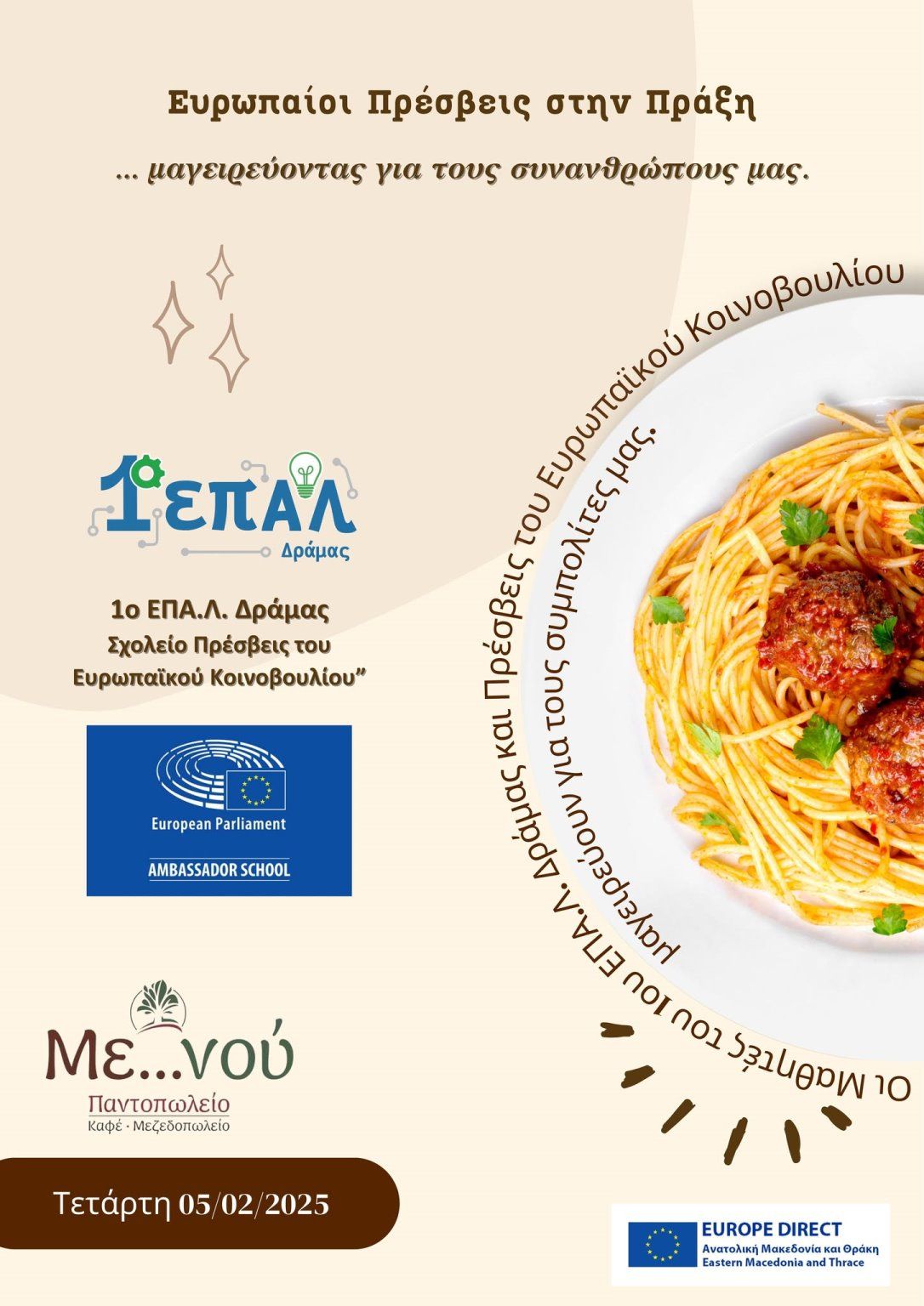 Οι μαθητές του 1ου ΕΠΑΛ Δράμας συμμετείχαν στην κοινωνική δράση «Μαγειρεύοντας για τους Συνανθρώπους μας», στο κοινωνικό παντοπωλείο ΜΕΝΟΥ, την Τετάρτη 5 Φεβρουαρίου 2025.